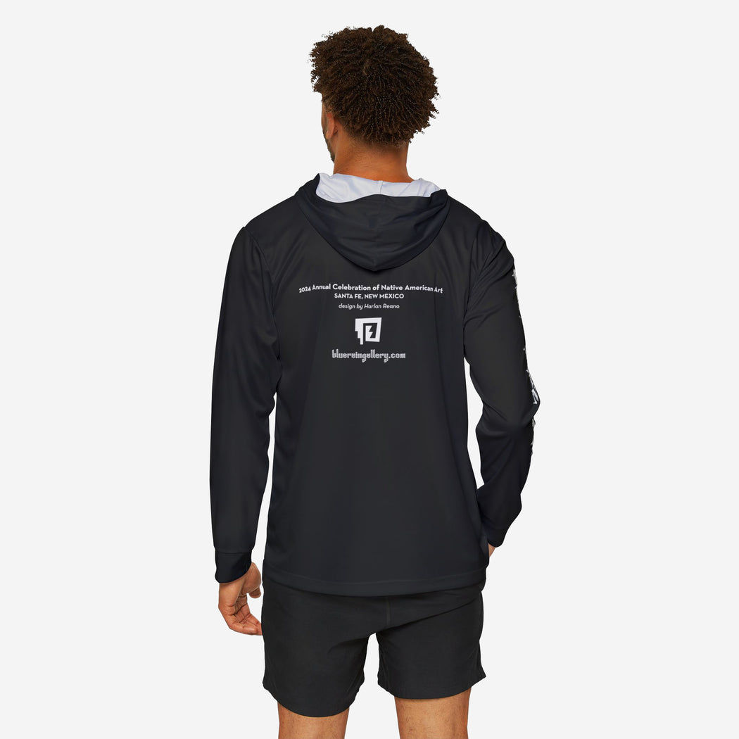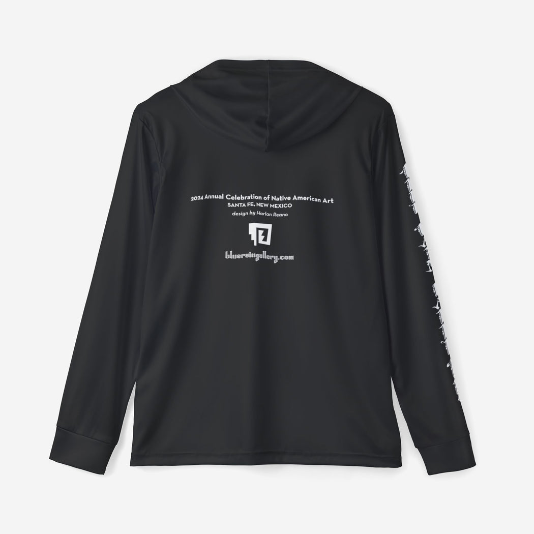 Whether it's hiking, working out, cycling, running, or simply lounging on a casual day, these hoodies remain breathable, stylish, and totally comfy. Printed with Harlan Reano's design for Blue Rain Gallery's 2024 Annual Celebration of Native American Art.