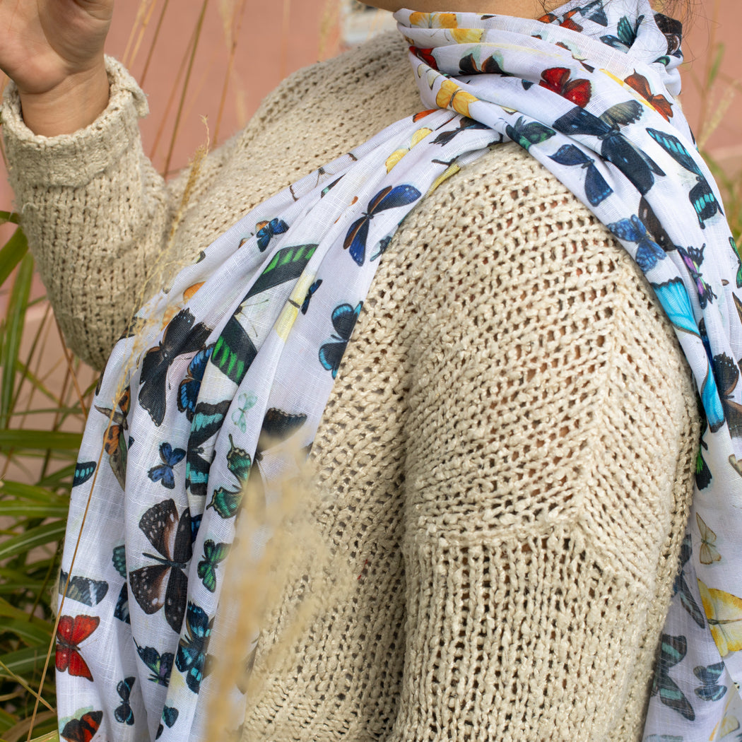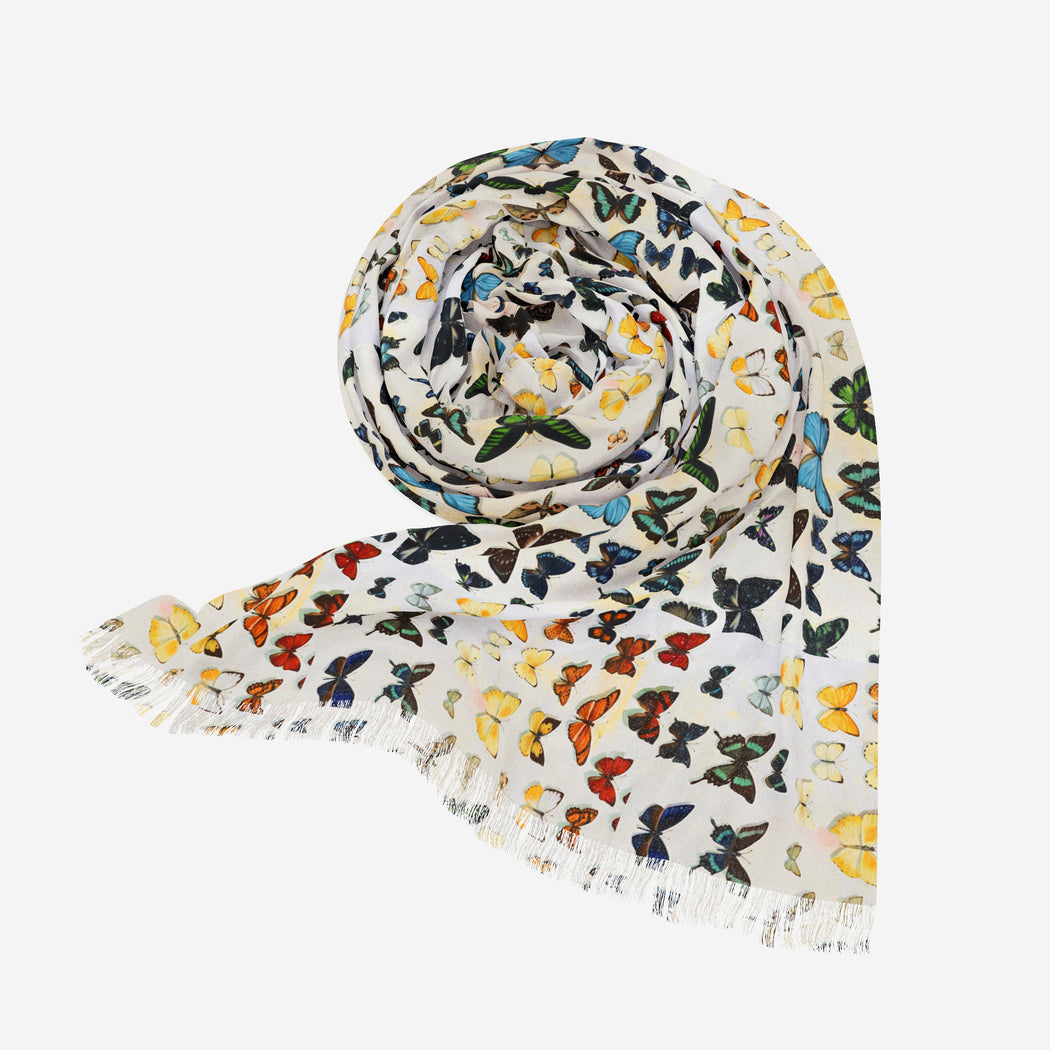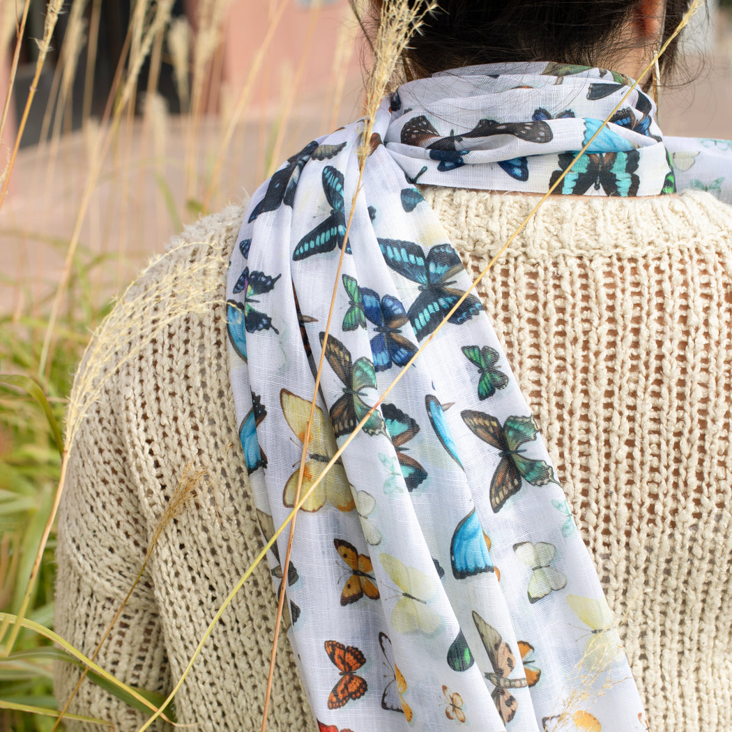 Create the perfect accessory that ties together any outfit with these long, lightweight scarves. Each scarf is transparent and printed with Andra Peterson's Butterfly Rainbow.