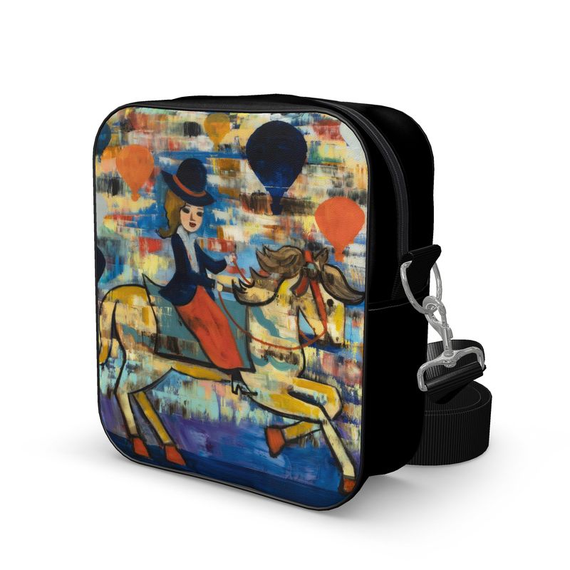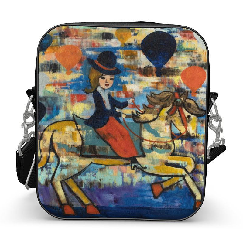 Classic leather messenger bag imprinted with Rimi Yang’s Happy Balloon.