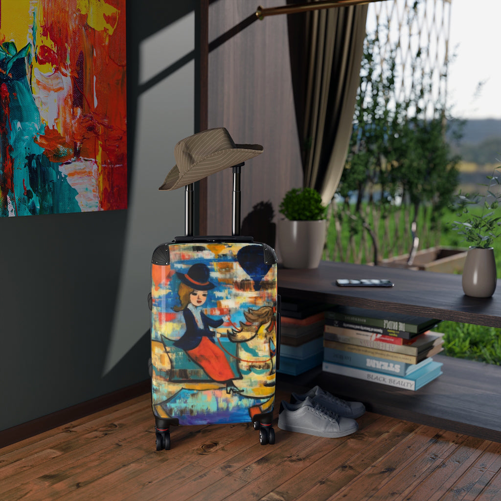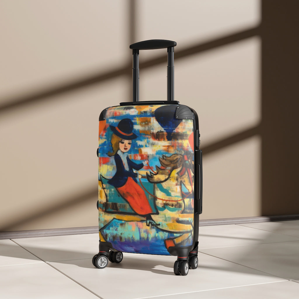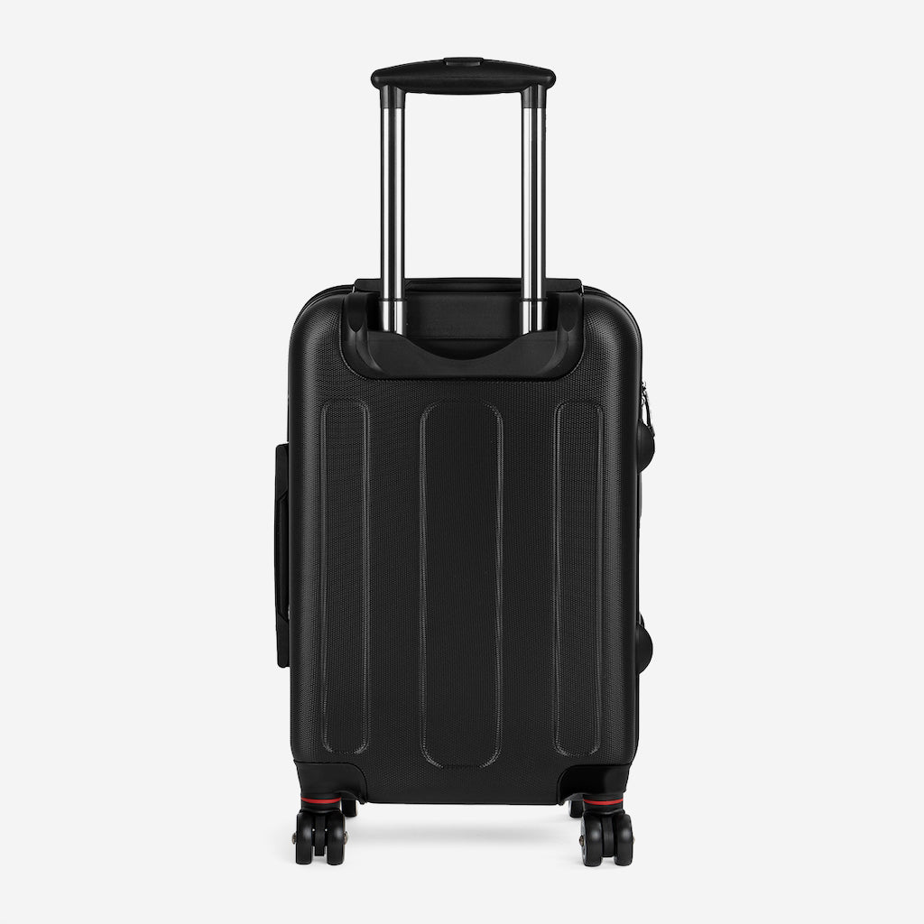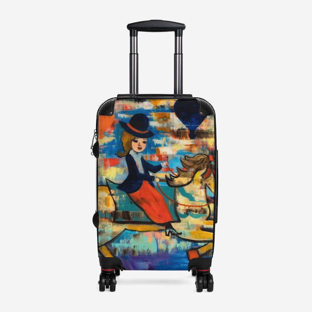 Make a bold statement with this wheeled carry on imprinted with Rimi Yang’s Happy Balloon.