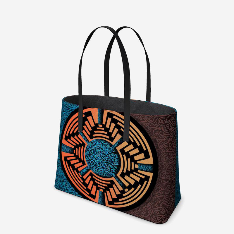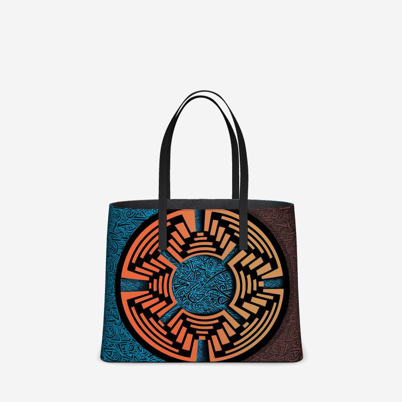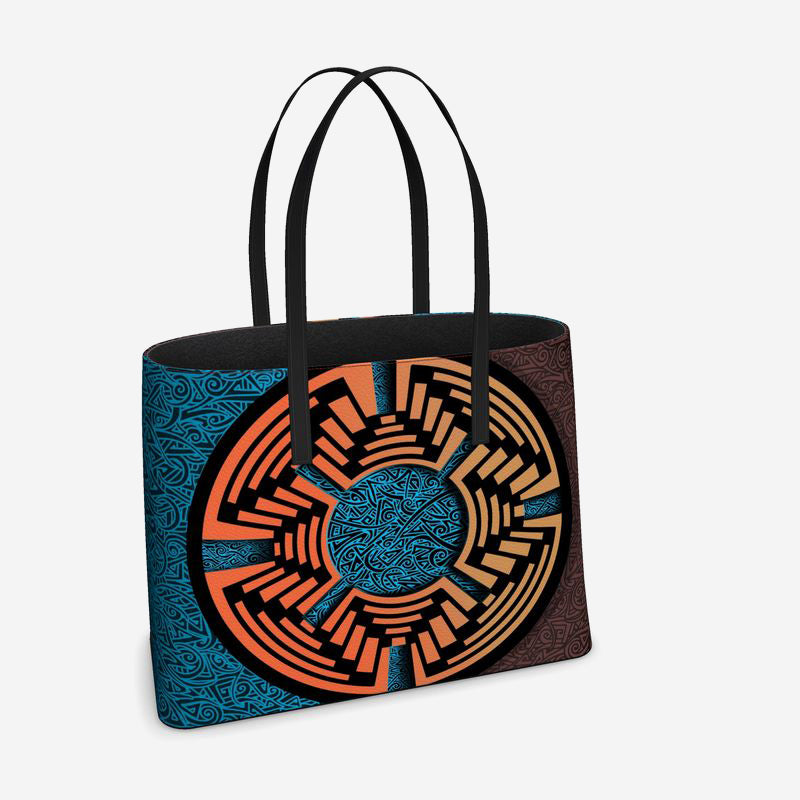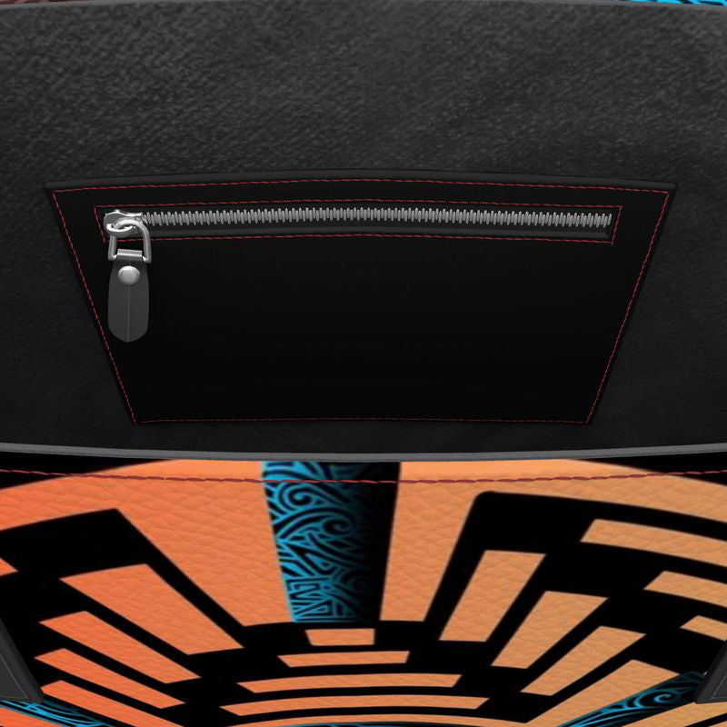 This stunning, custom leather tote is imprinted with Thomas Breeze Marcus's Hiosik Futurism.