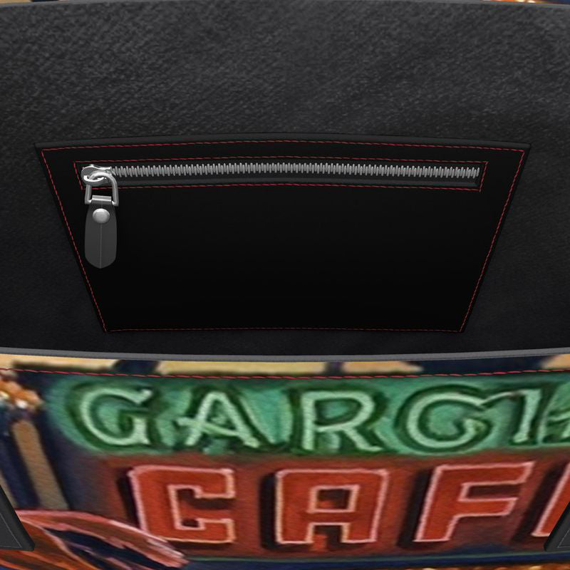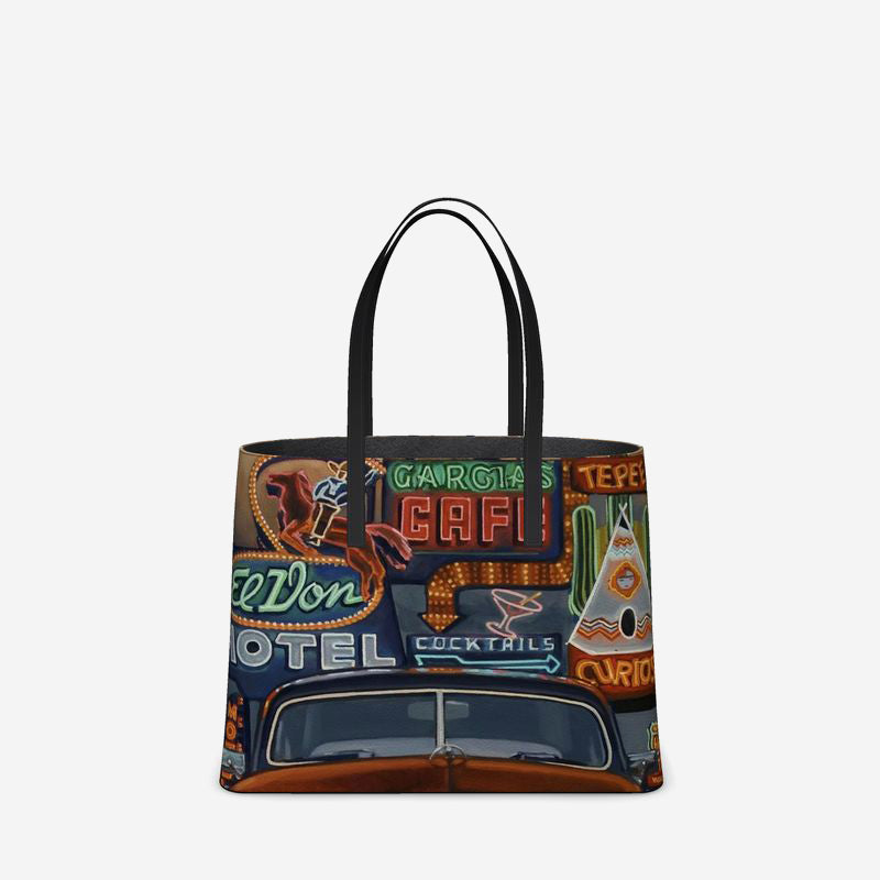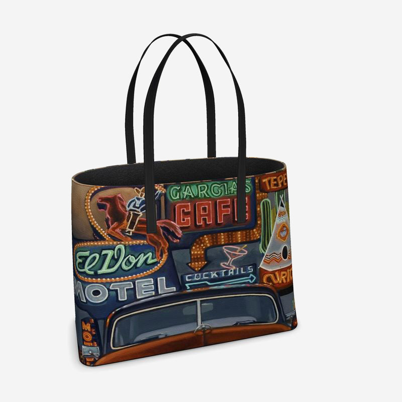 leather tote is imprinted with Dennis Ziemienski’s New Mexico Lights.
