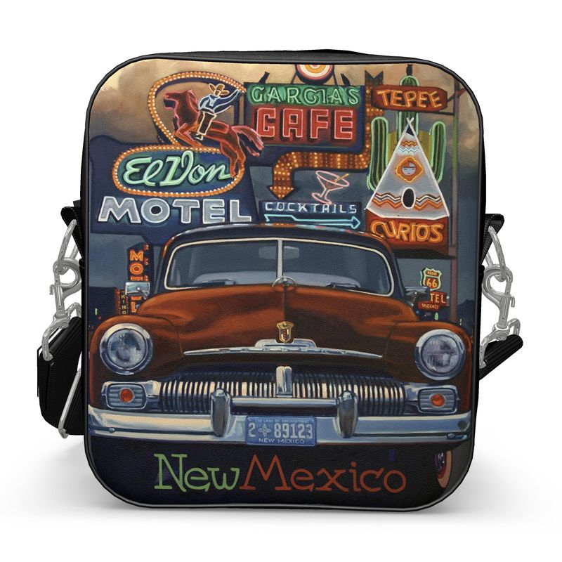 Classic leather messenger bags are imprinted with Dennis Ziemienski’s New Mexico Lights.