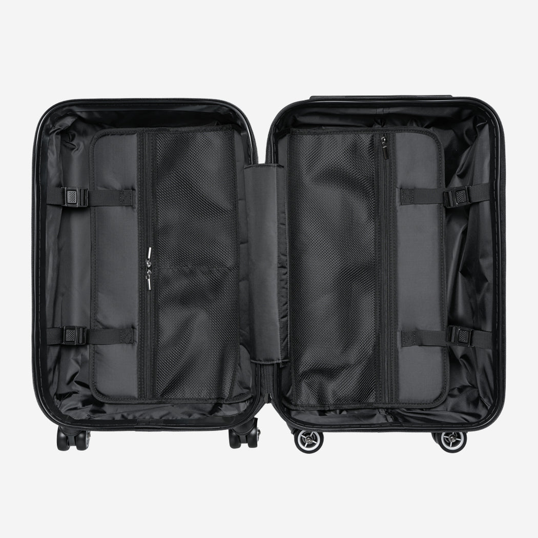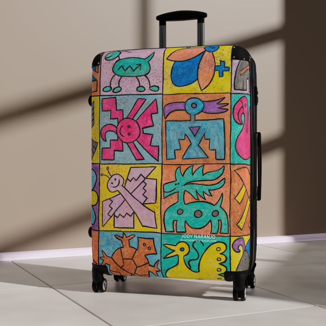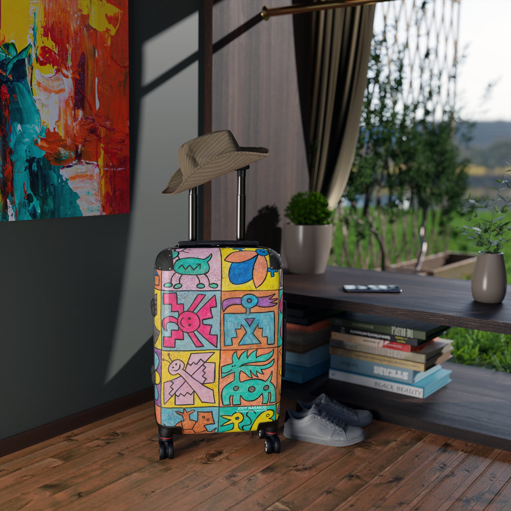 Make a bold statement with this wheeled carry on imprinted with Jody Naranjo's Play Time.