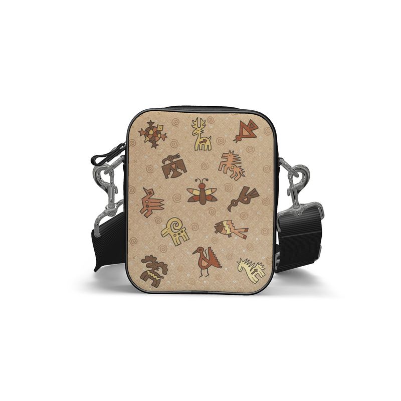 Classic leather messenger bags are imprinted with Jody Naranjo’s Pueblo Constellations.