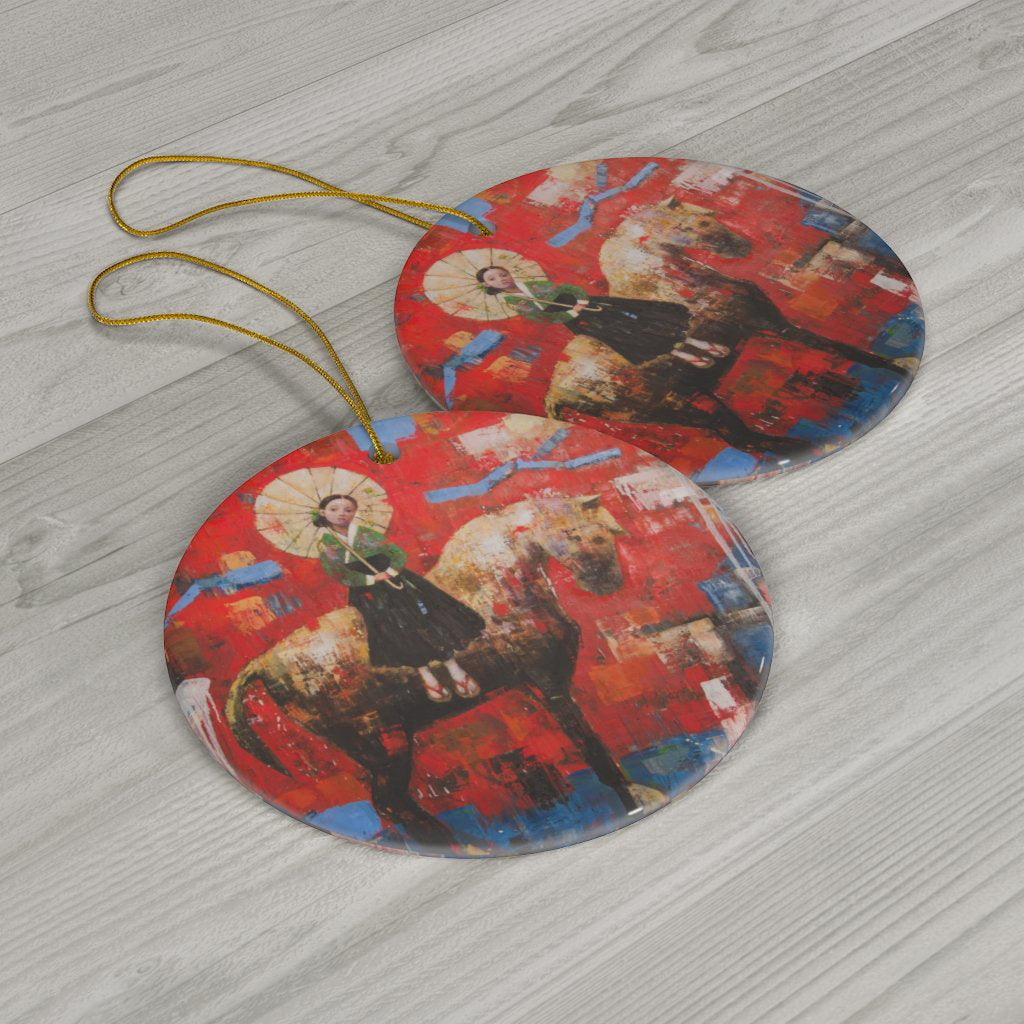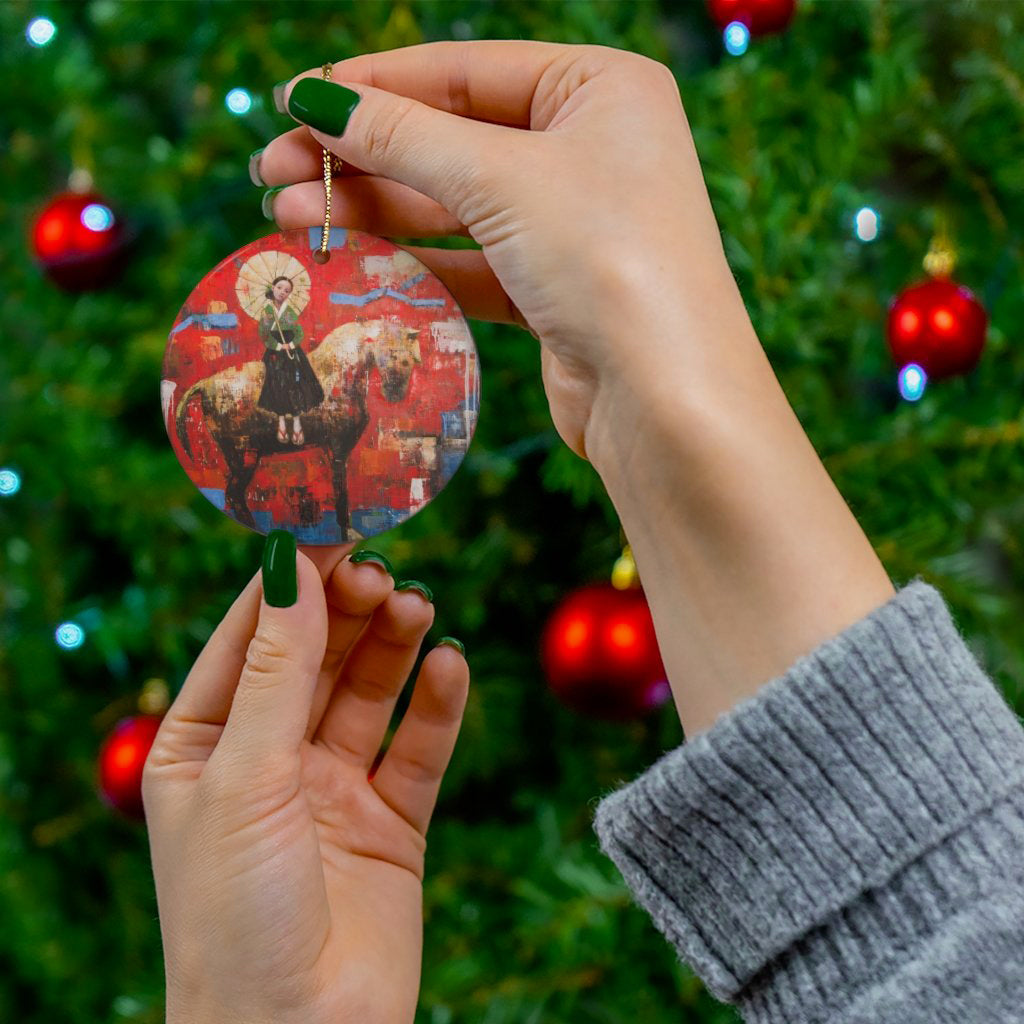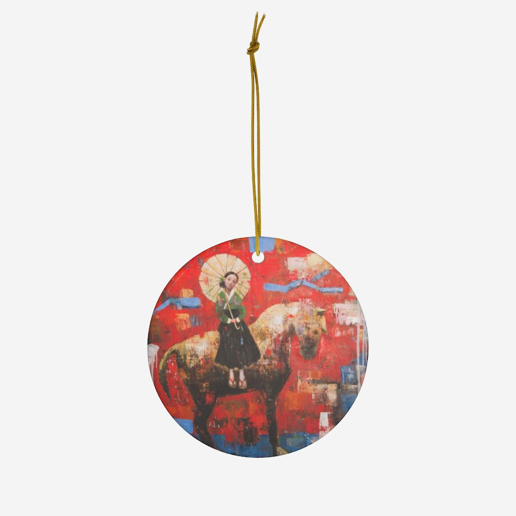 This custom-made ceramic ornament can be the perfect heirloom to use year after year, printed with Rims Yang’s Ride In Sunset.