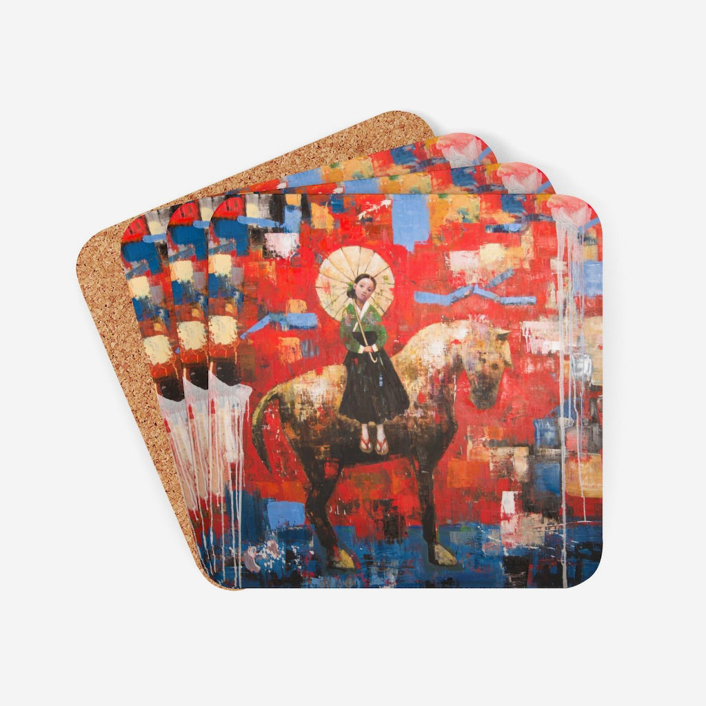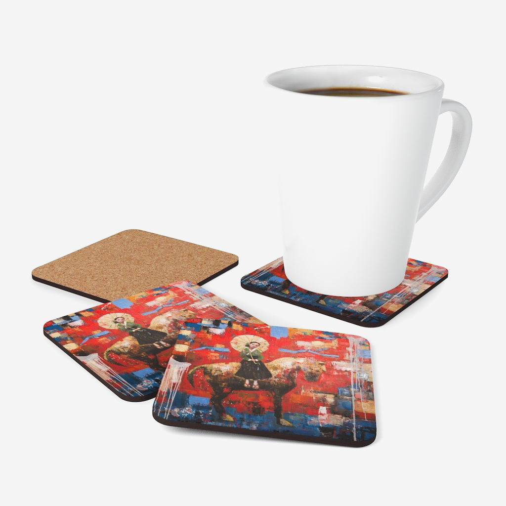 Set of four coasters with a high-gloss top and feature a cork back to prevent sliding.
