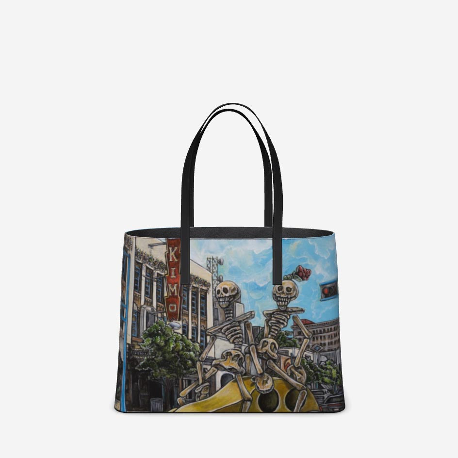This stunning, custom leather tote is imprinted with Joshua S. Franco's I Love Going On Road Trips With You.