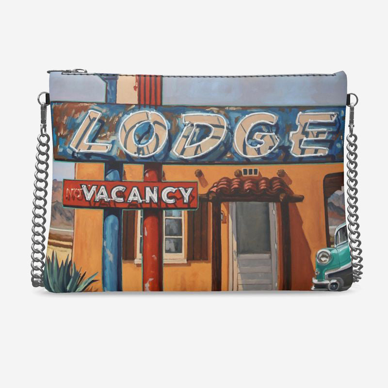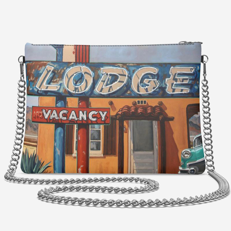 This beautiful designer crossbody bag is imprinted with Dennis Ziemienski's Santa Fe Lodge.