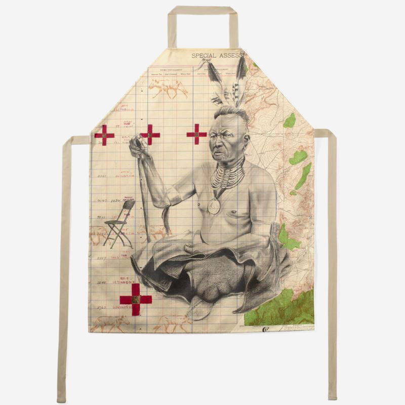 Aprons are handmade and printed with Chris Pappan’s See Haw Directs An Alien Invasion From The South.