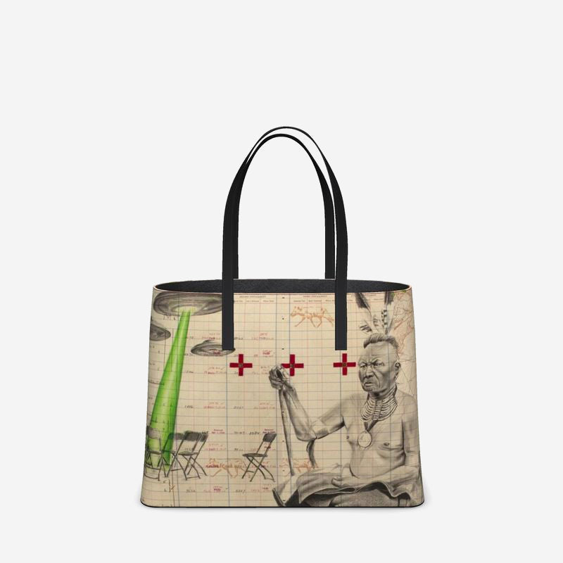 This stunning, custom leather tote is imprinted with Chris Pappan's See Haw Directs An Alien Invasion From The South.