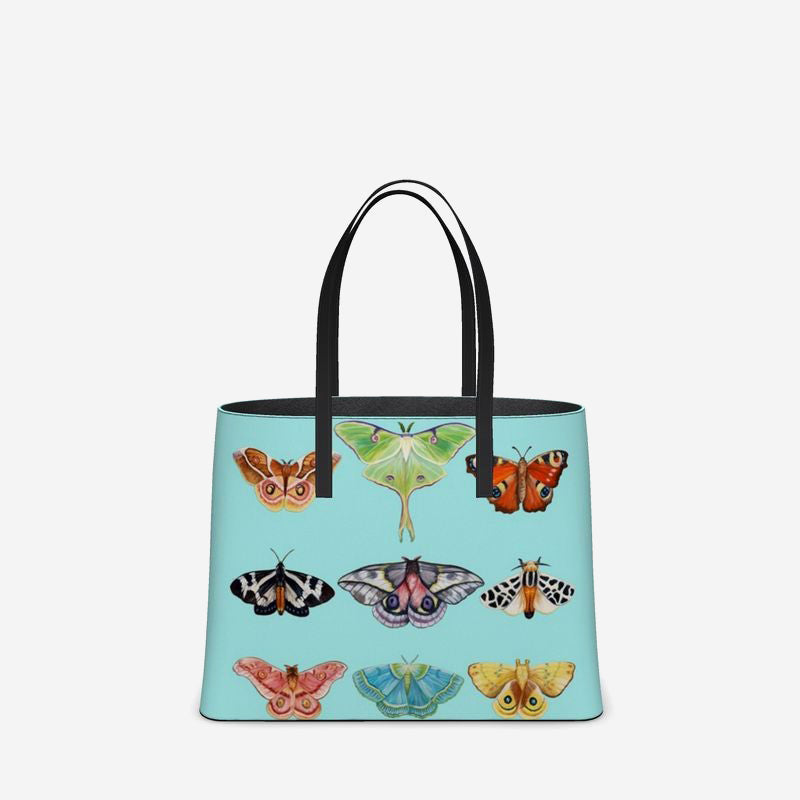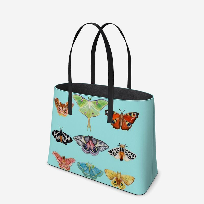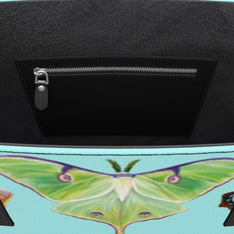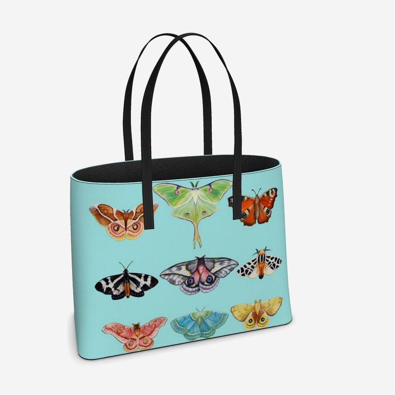 leather tote is imprinted with Andrea Peterson's Silver Chrysalis.