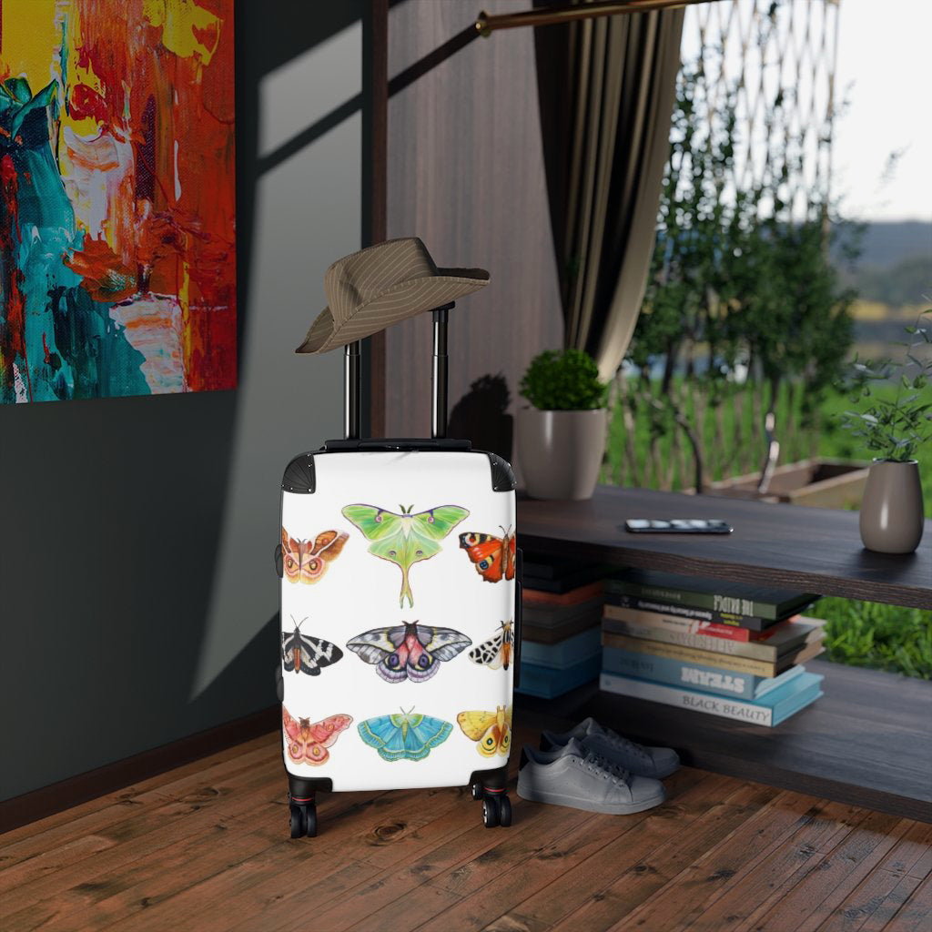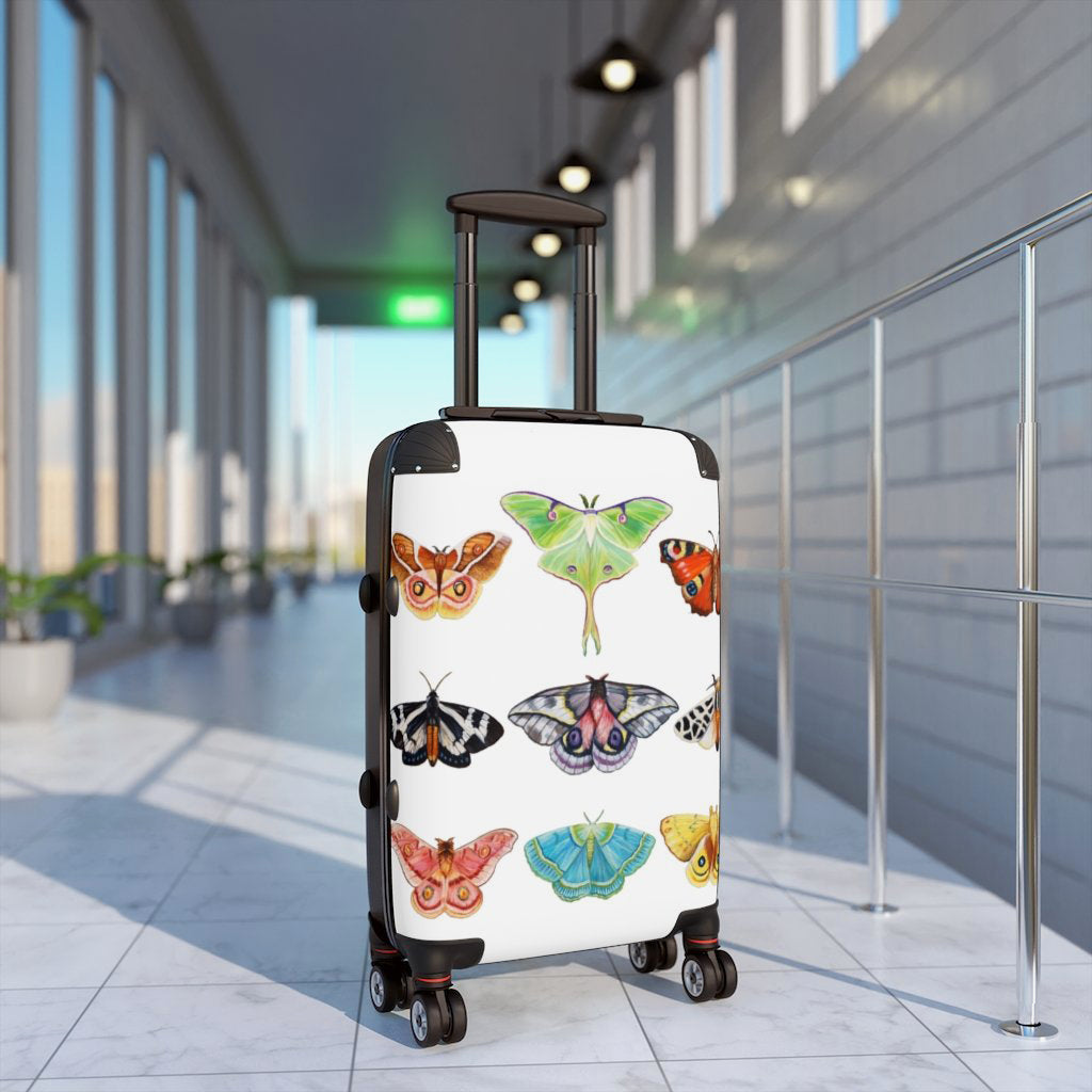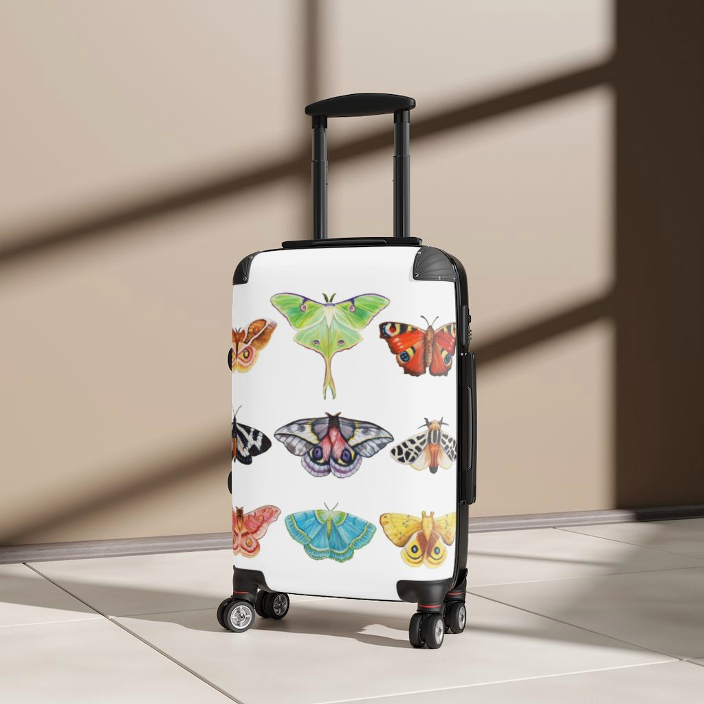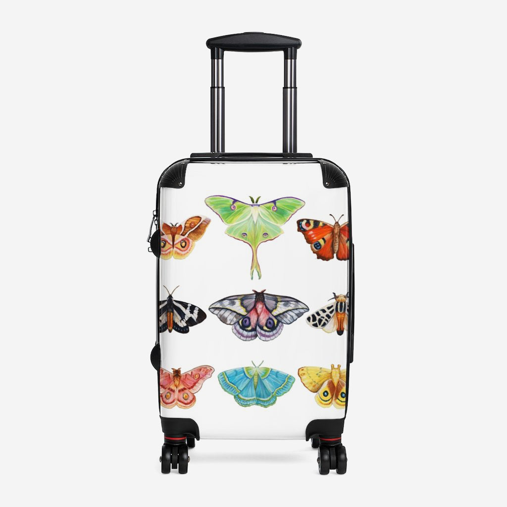 Make a bold statement with this wheeled carry on imprinted with Andrea Peterson’s Silver Chrysalis.