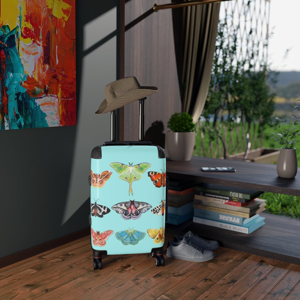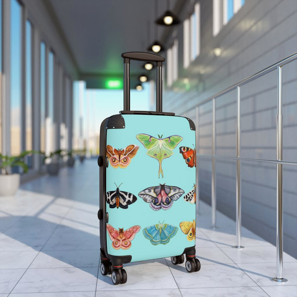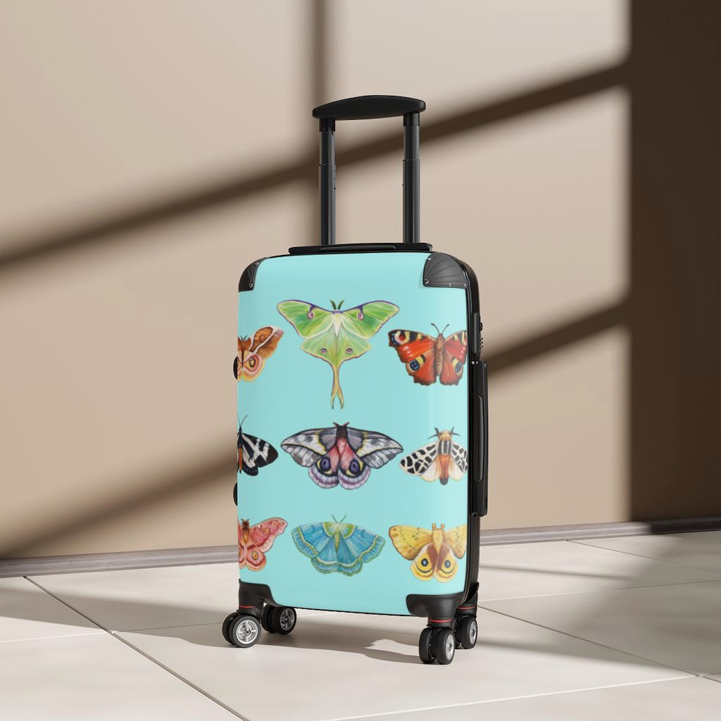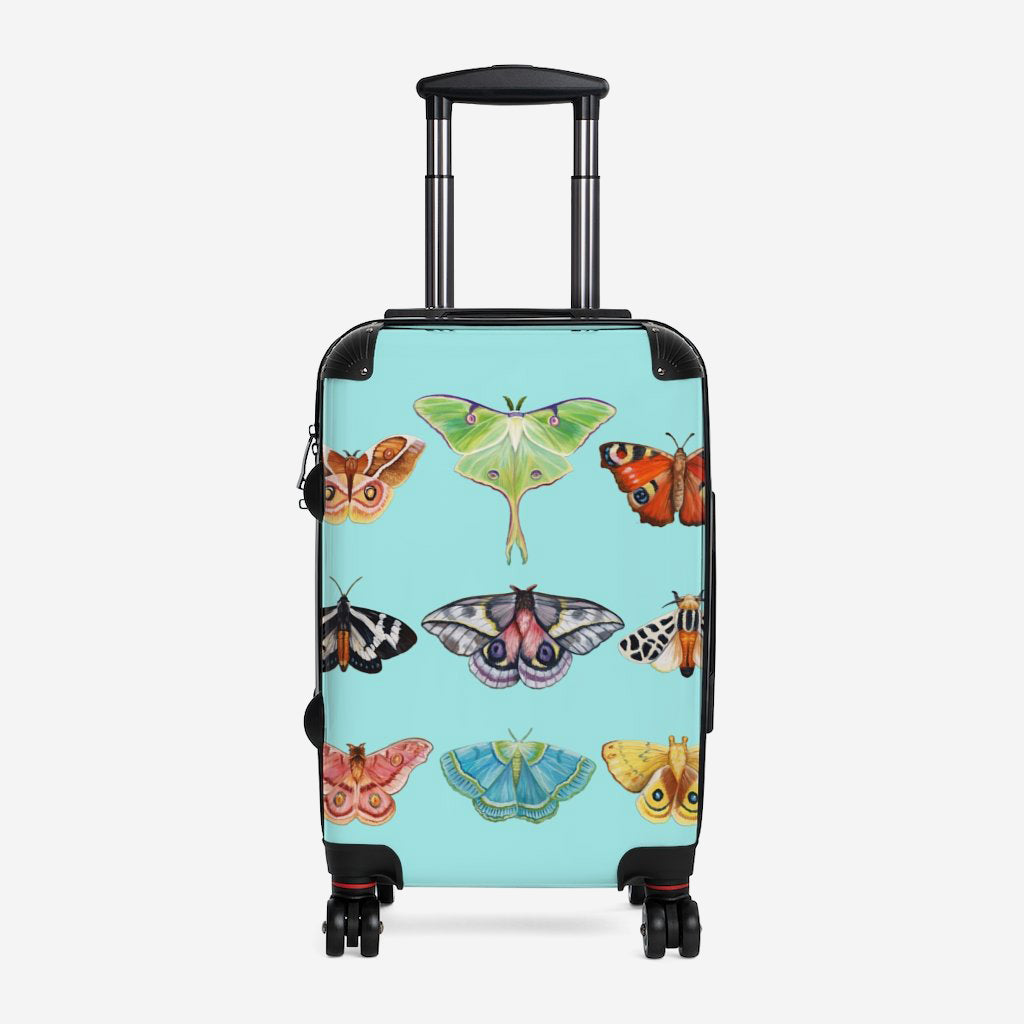 Make a bold statement with this wheeled carry on imprinted with Andrea Peterson’s Silver Chrysalis.