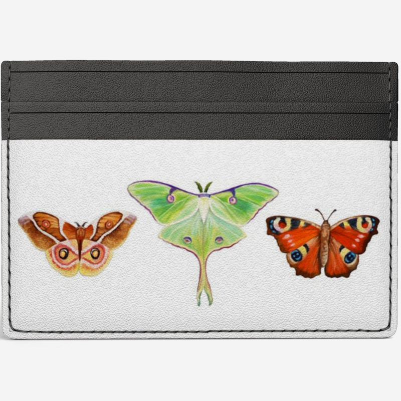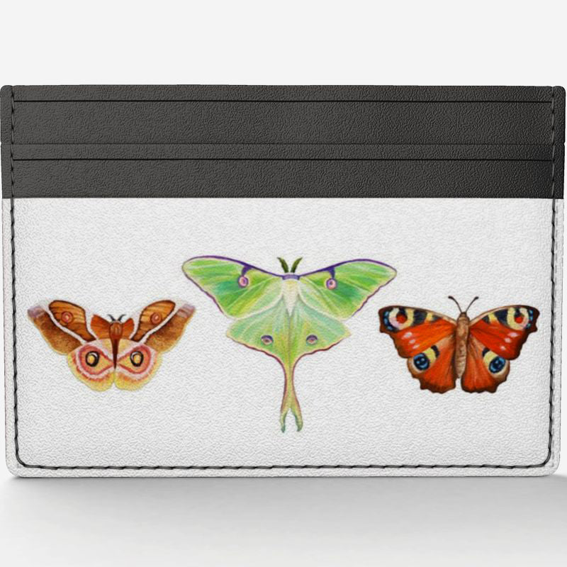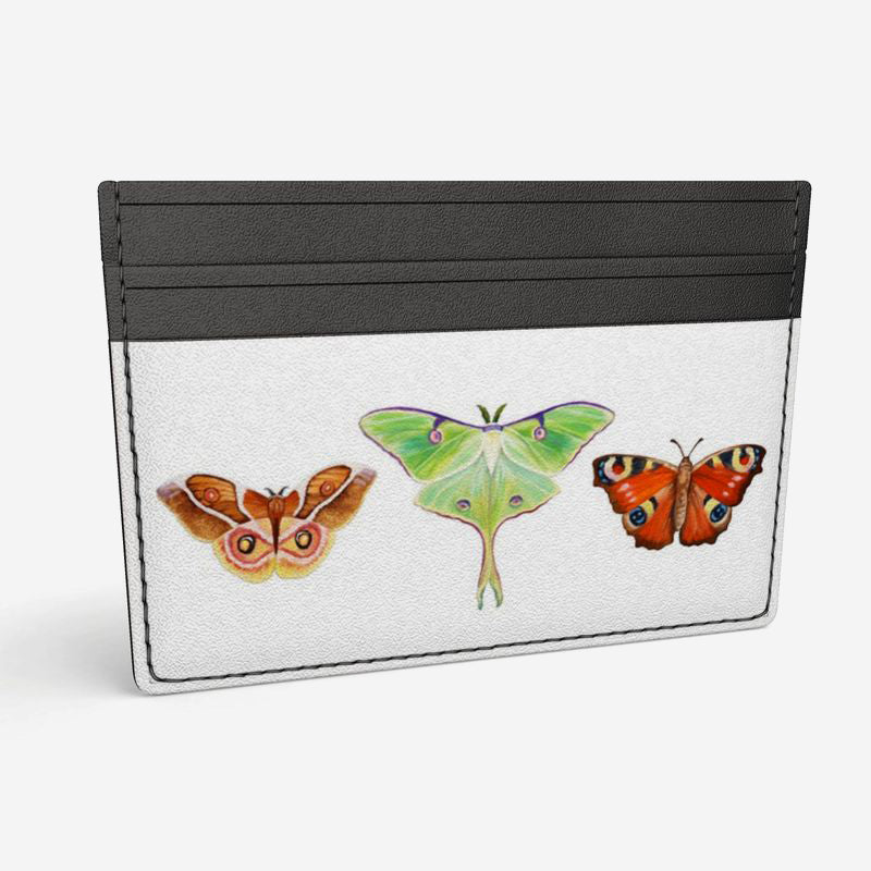 This custom leather card holder is imprinted with Andrea Peterson’s Silver Chrysalis.