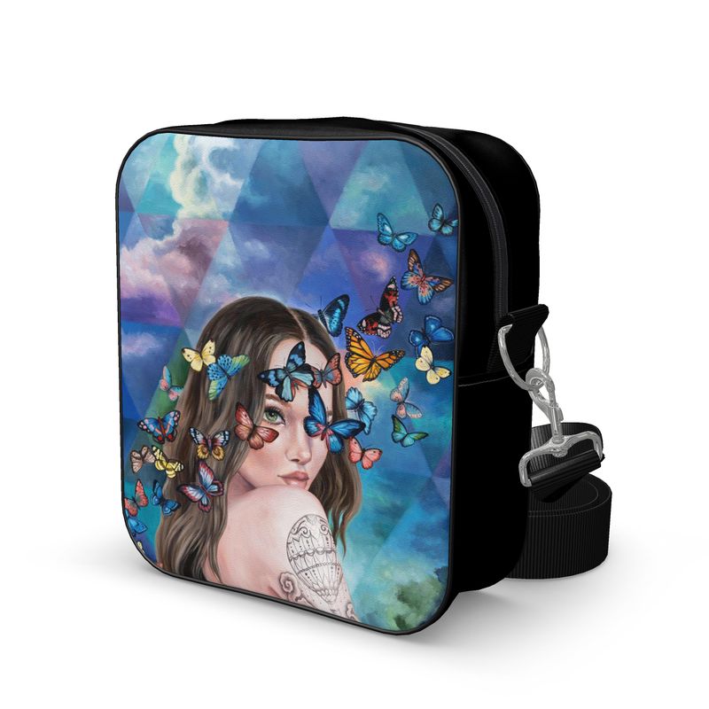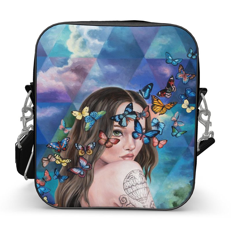 Classic leather messenger bag imprinted with Andrea Peterson’s Silver Linings.