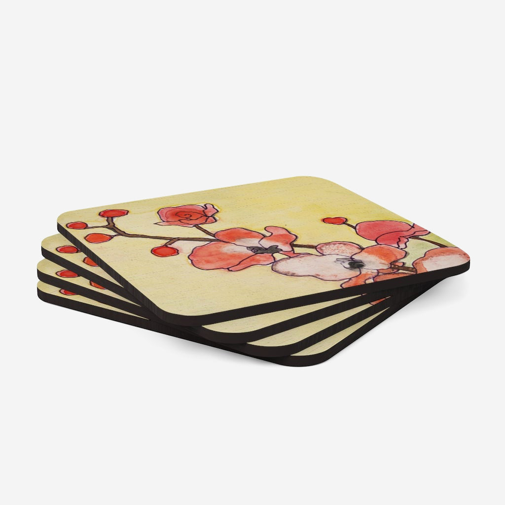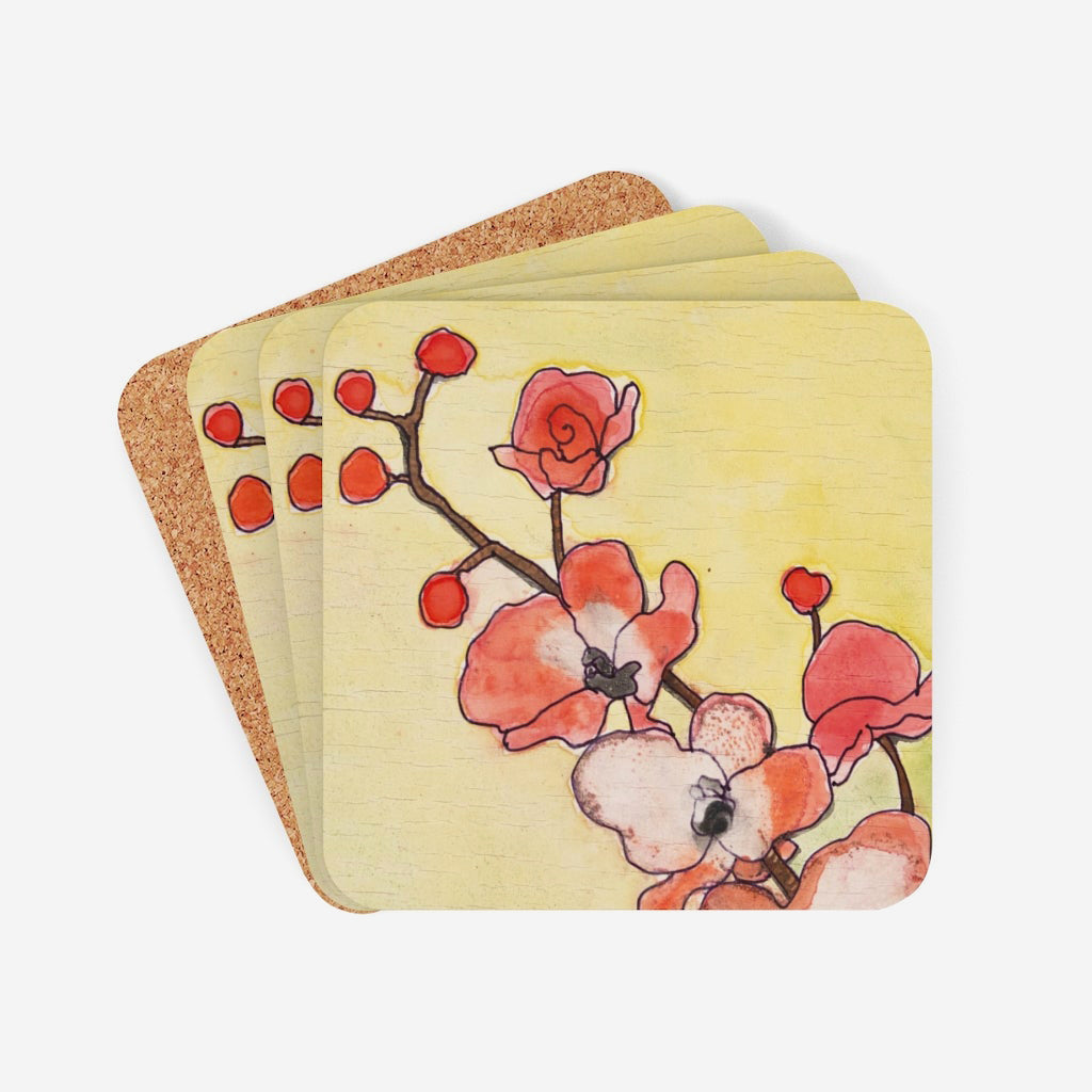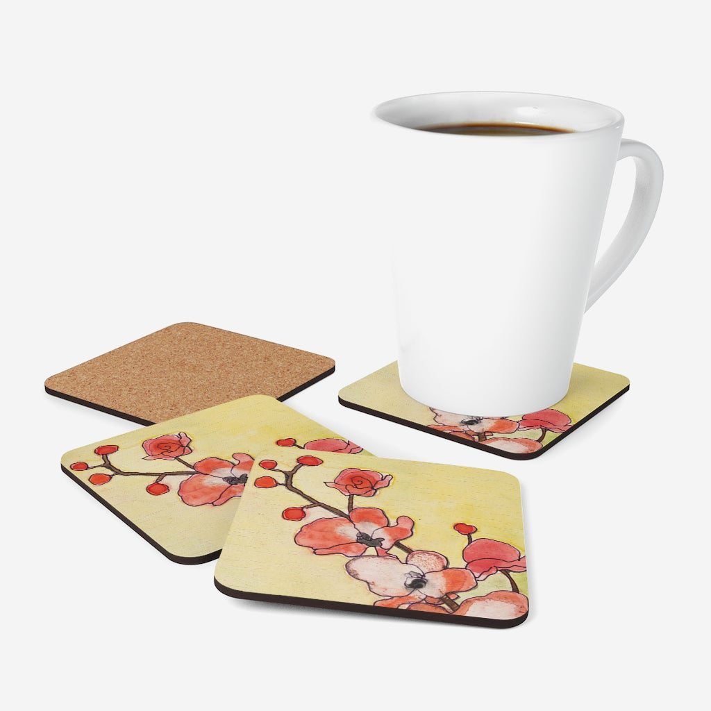 Set of four coasters with a high-gloss top and feature a cork back to prevent sliding.