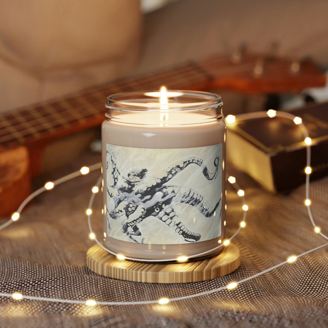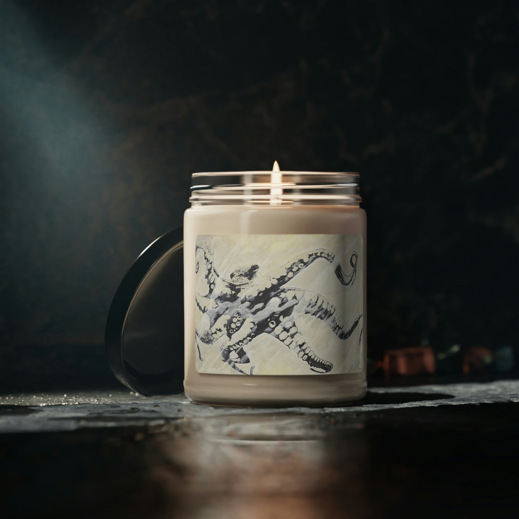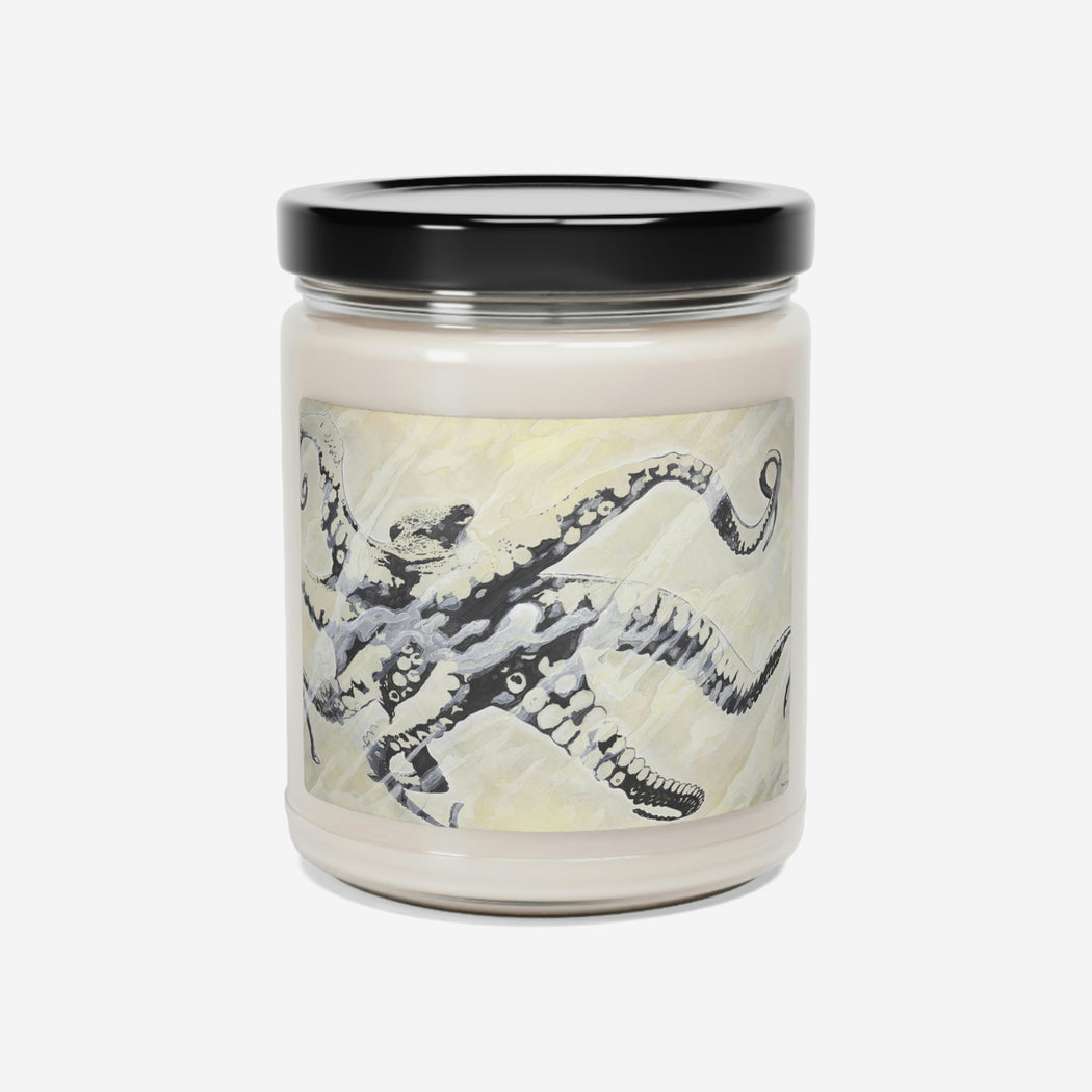 Packed with immersive aromas, these scented candles are made with 100% natural soy wax blend. Printed with Joshua Franco's The Octopus.