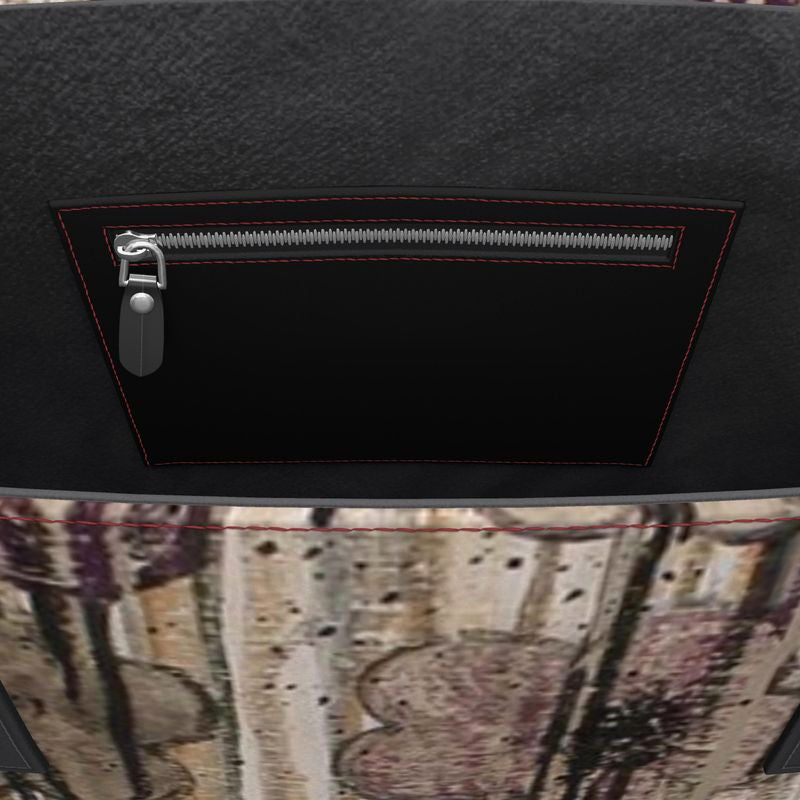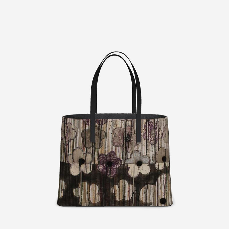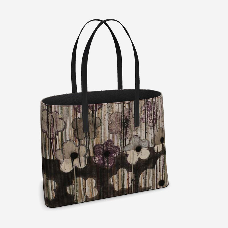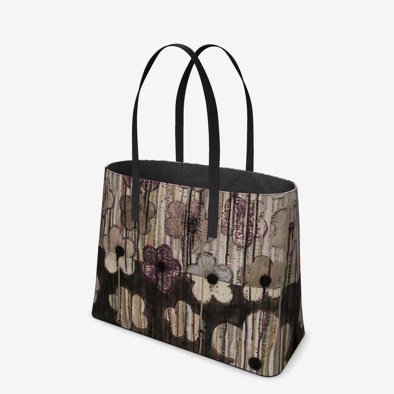 This stunning, custom leather tote is imprinted with Helen K. Tindel's Thunder Blooms.