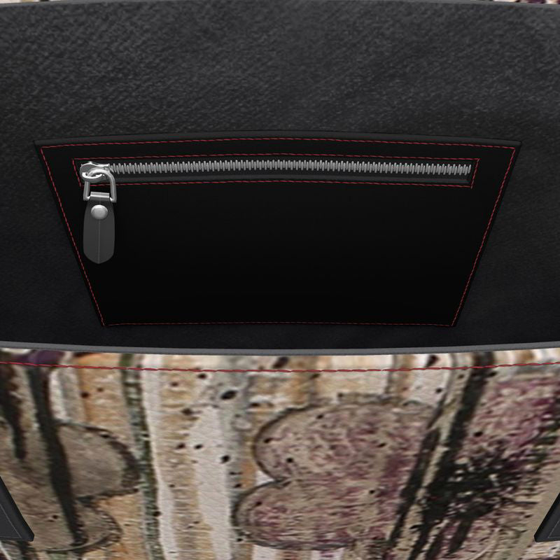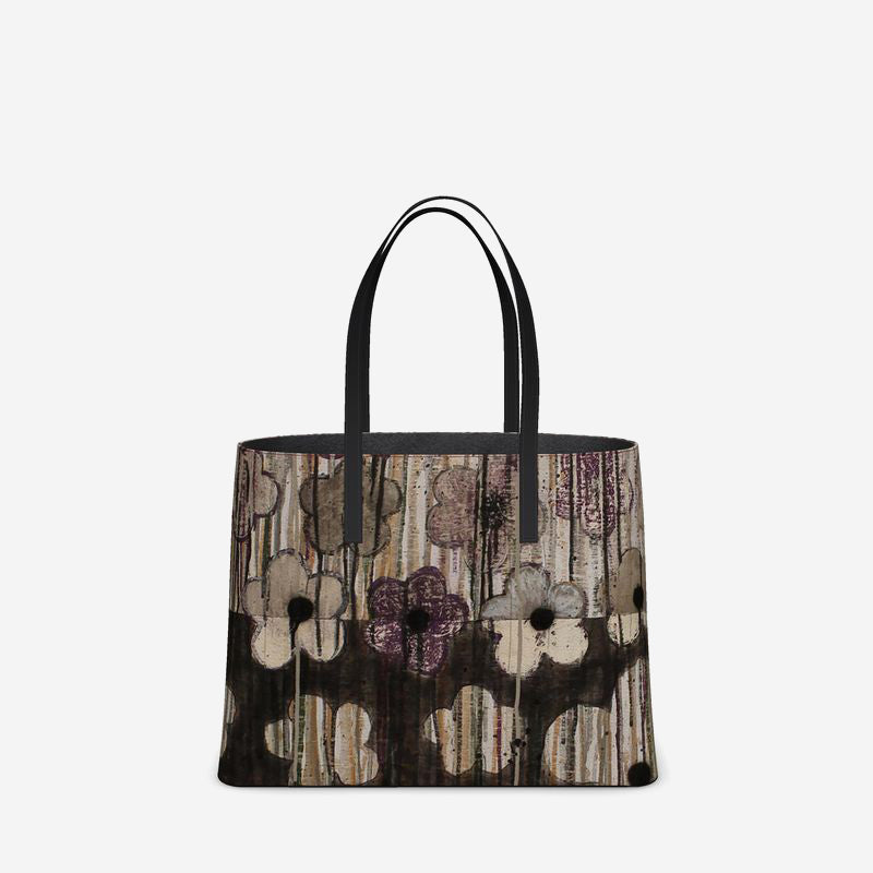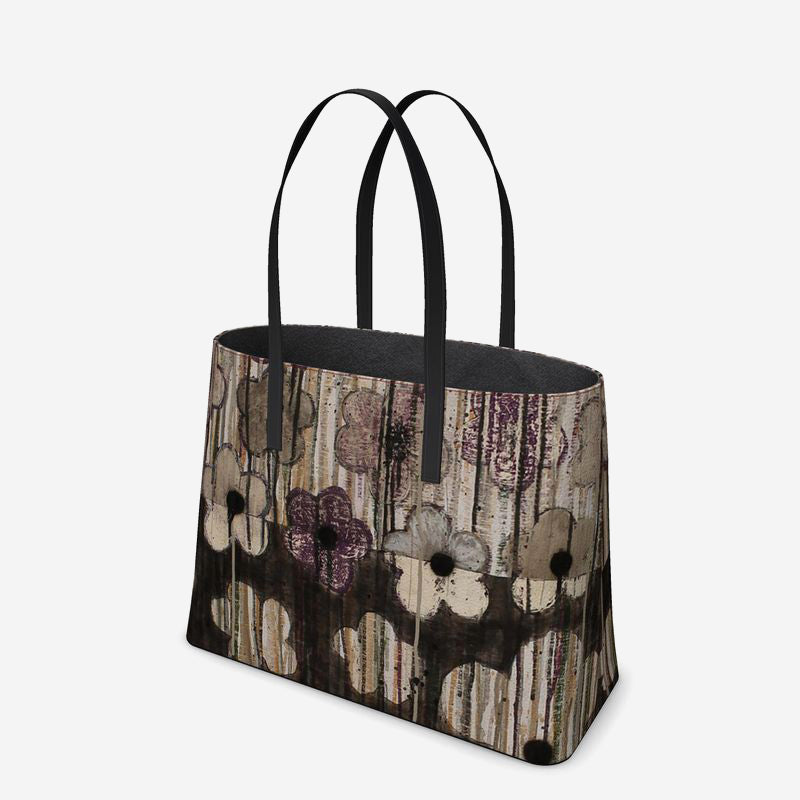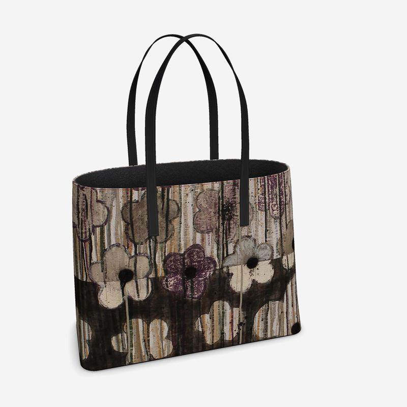 This stunning, custom leather tote is imprinted with Helen K. Tindel's Thunder Blooms.