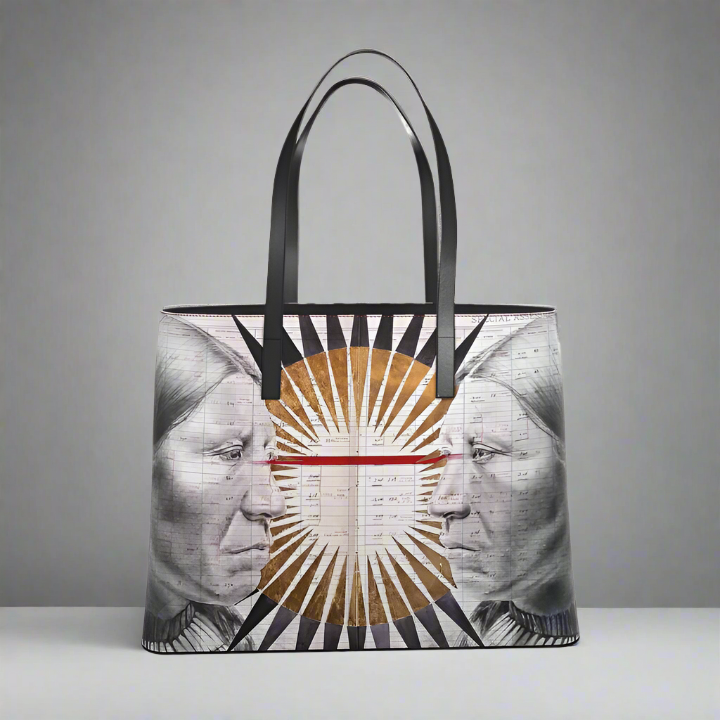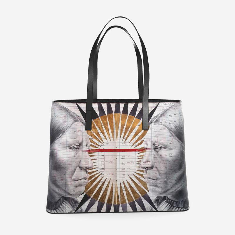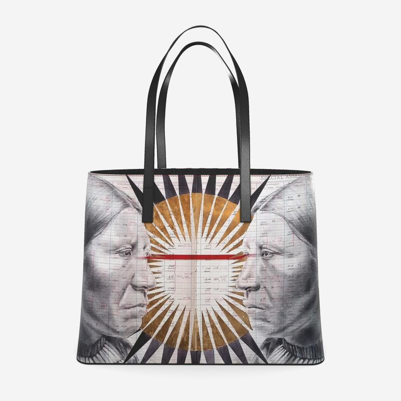 This stunning, custom leather tote is imprinted with Chris Pappan's Welcoming.