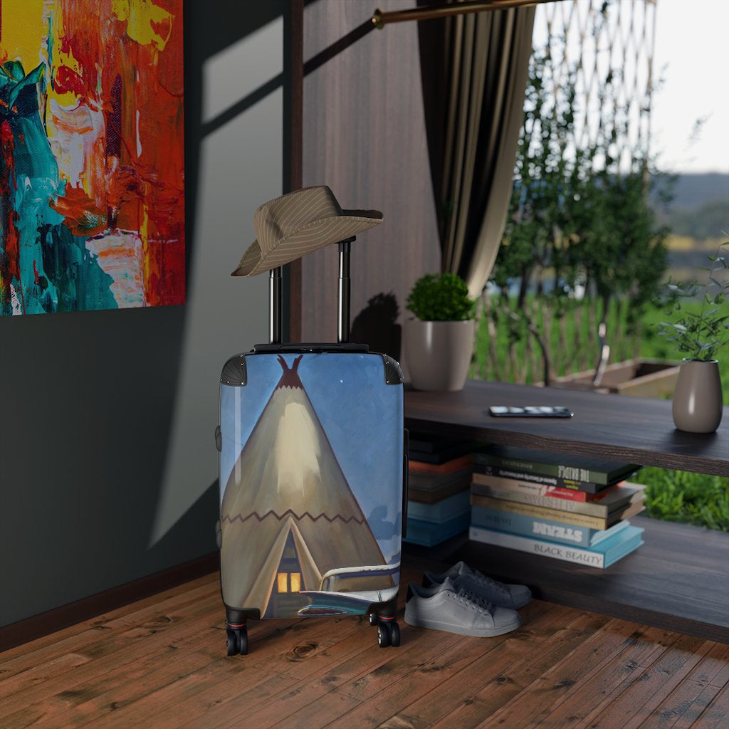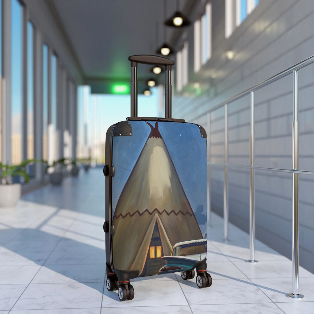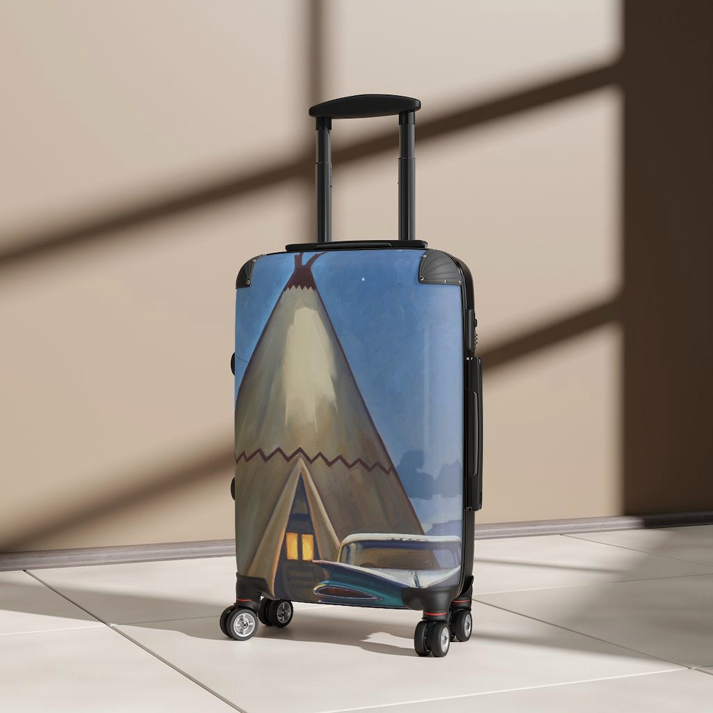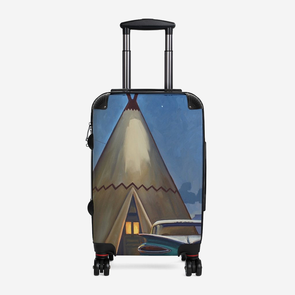 Make a bold statement with this wheeled carry on imprinted with Dennis Ziemienski’s Wig Wam Nocturne.