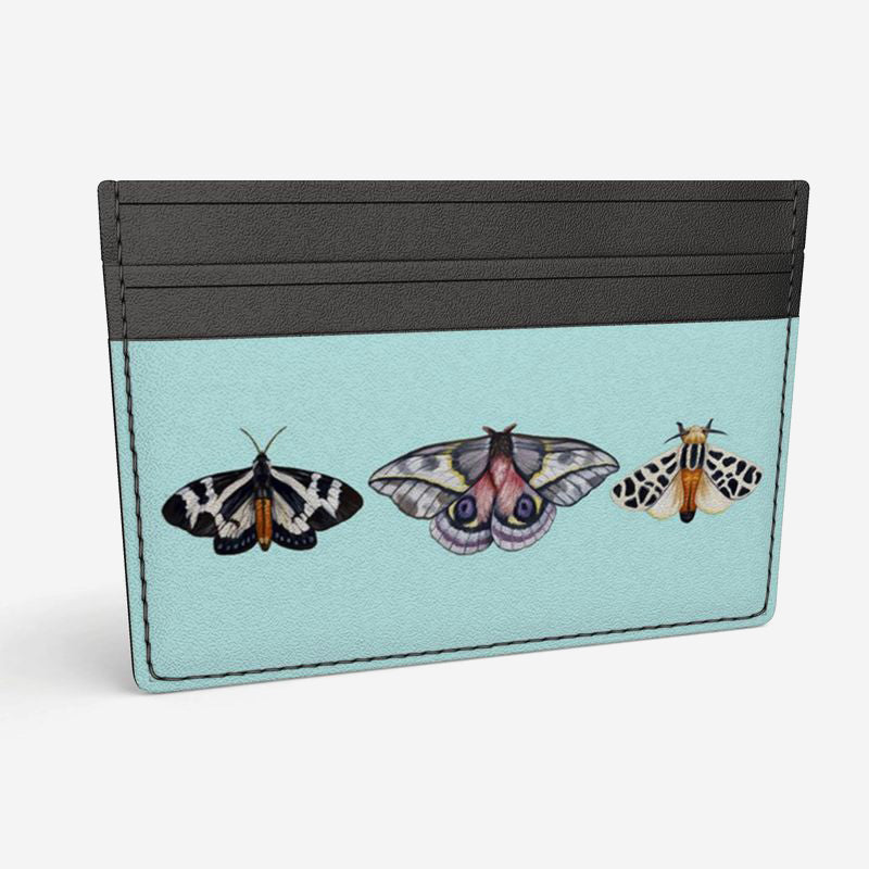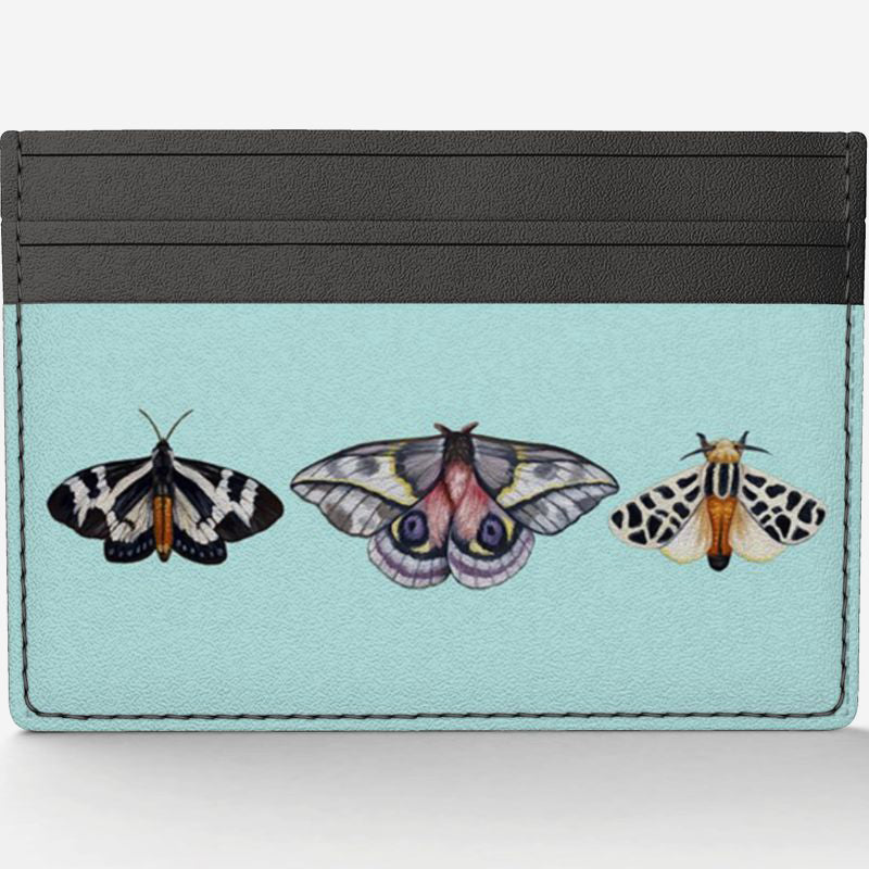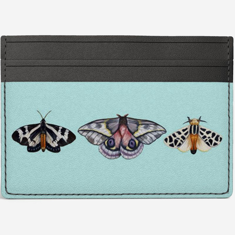This custom leather card holder is imprinted with Andrea Peterson’s Silver Chrysalis.