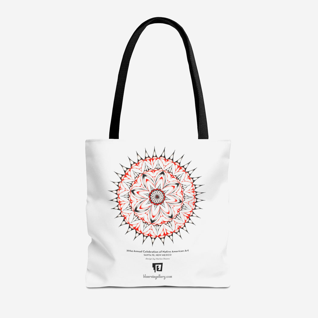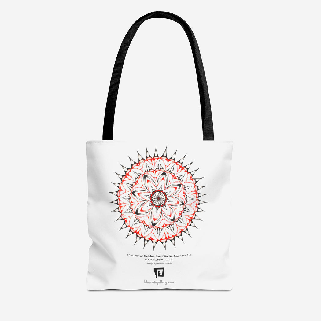 Make a difference by switching to an eco-friendly tote with Blue Rain's 2024 Annual Celebration of Native Art printed with imagery by Harlan Reano.
