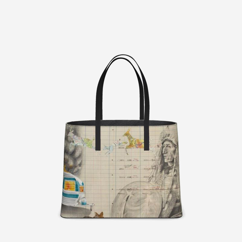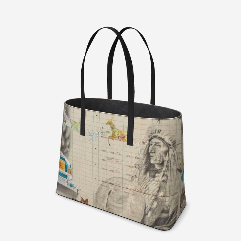 This stunning, custom leather tote is imprinted with Chris Pappan's The Fire Within.