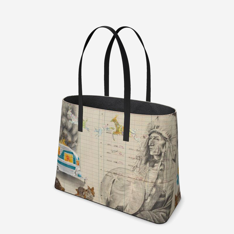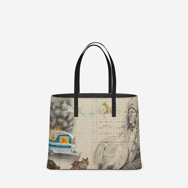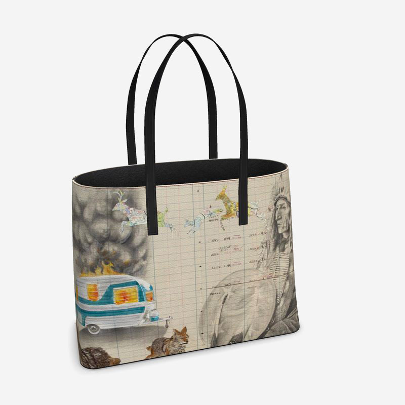 This stunning, custom leather tote is imprinted with Chris Pappan's The Fire Within.
