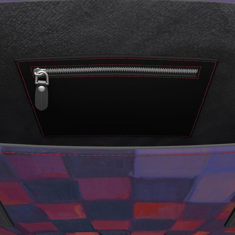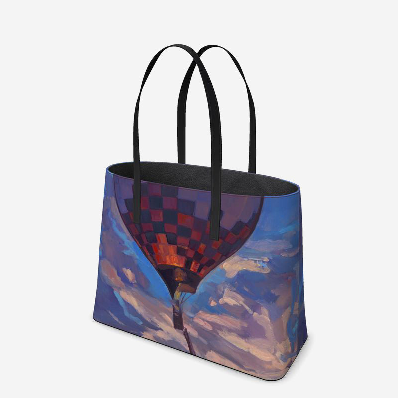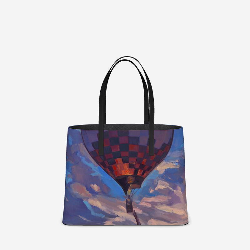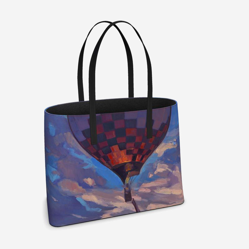 This stunning, custom leather tote is imprinted with Kathryn Stedham's Up and Away, Sandia Sky.