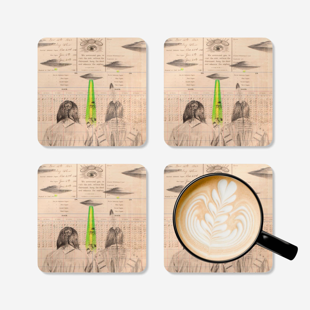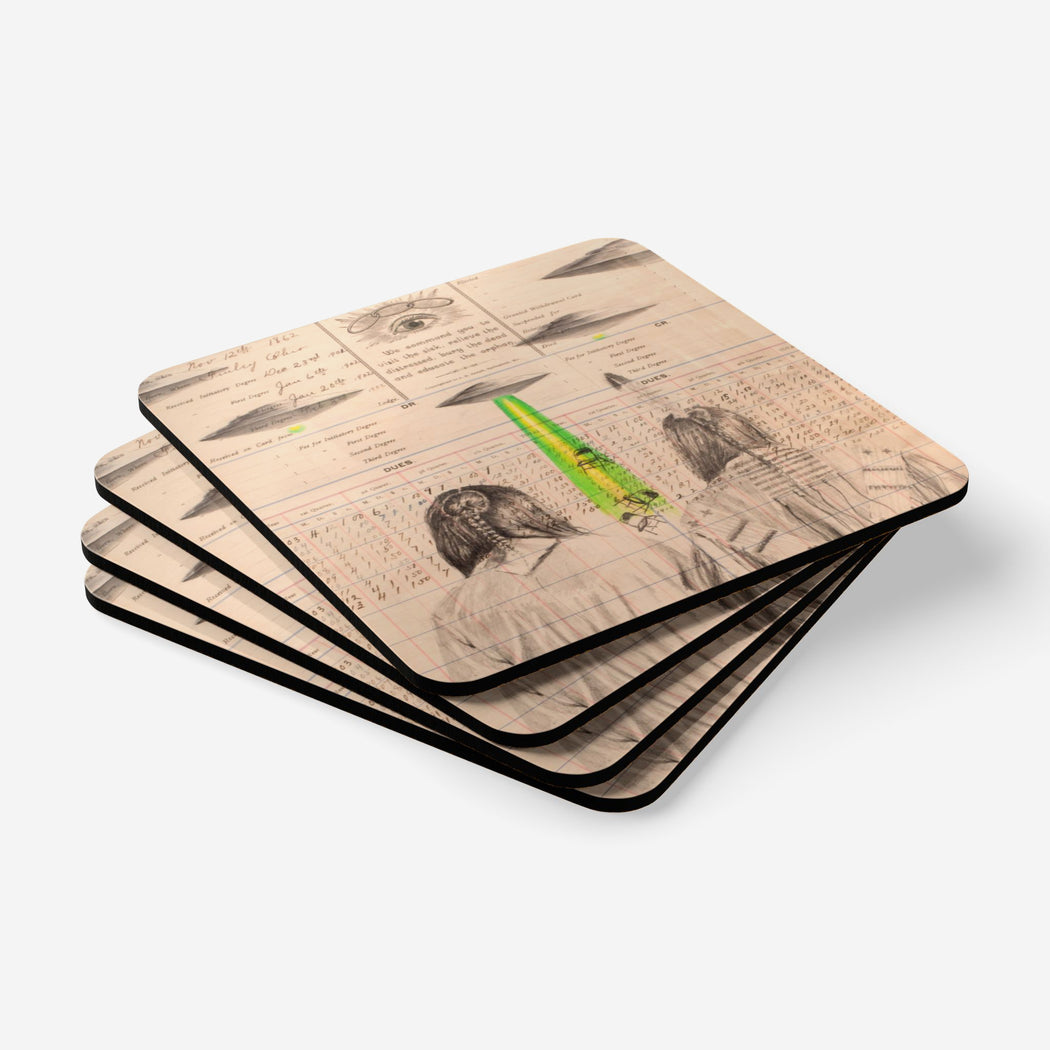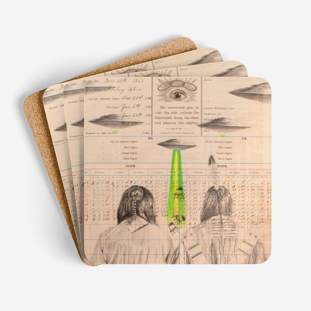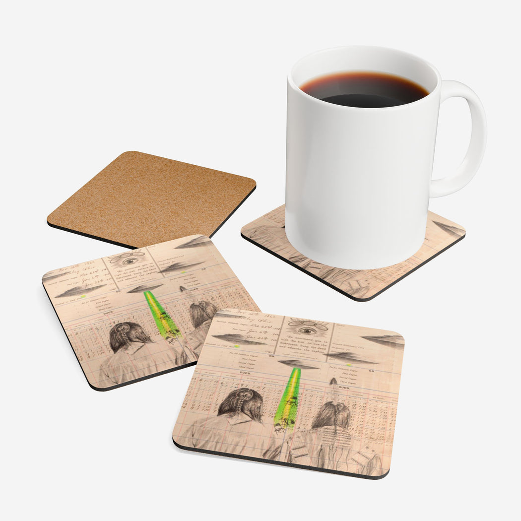 Set of four coasters with a high-gloss top and feature a cork back to prevent sliding.