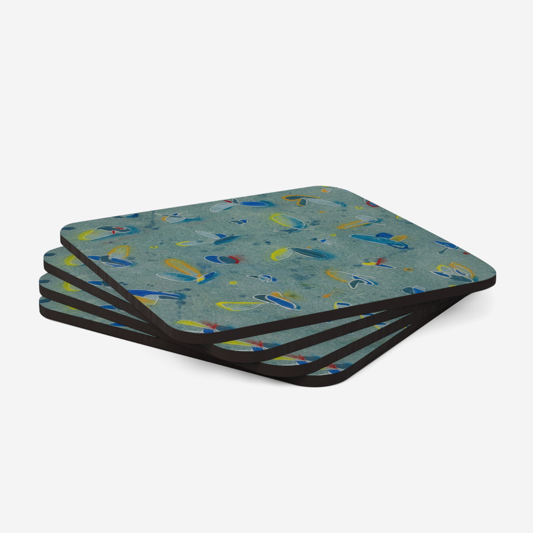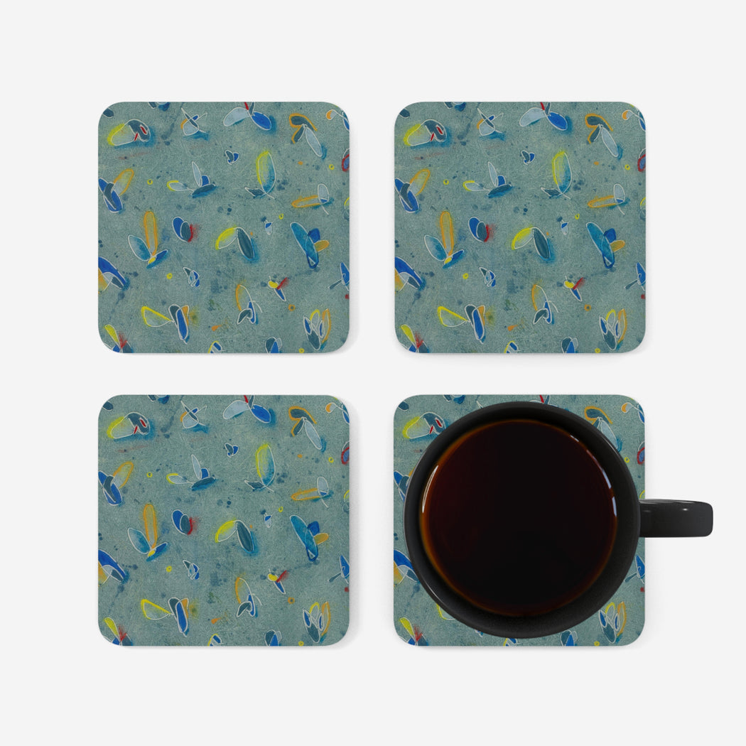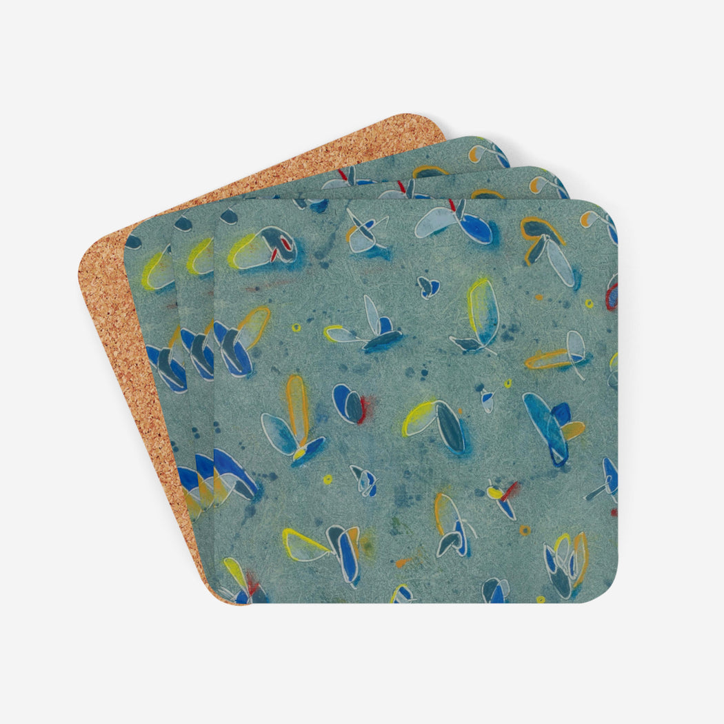 Set of four coasters with a high-gloss top and feature a cork back to prevent sliding.