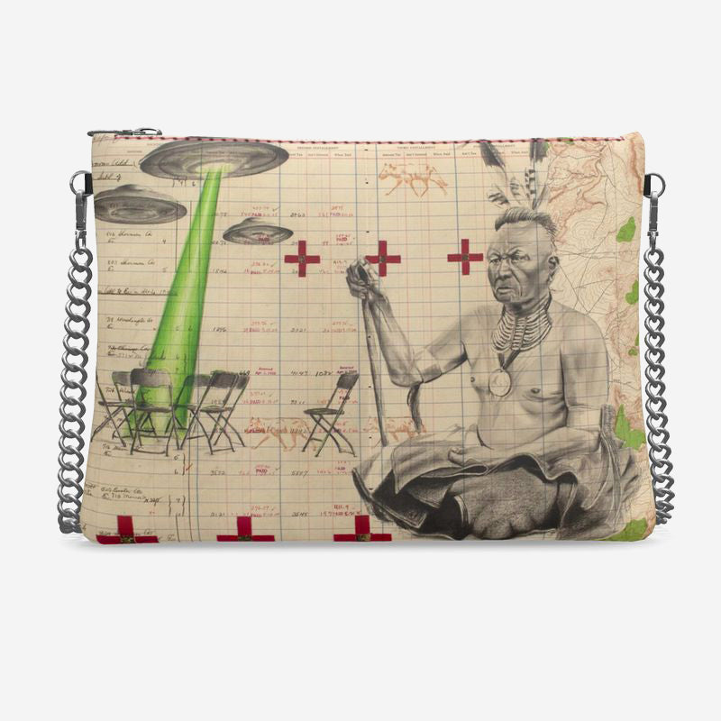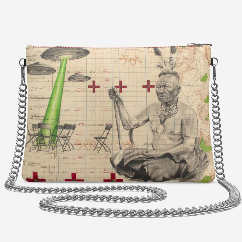 This beautiful designer crossbody bag is imprinted with Chris Pappan's See Haw Directs An Alien Invasion From The South