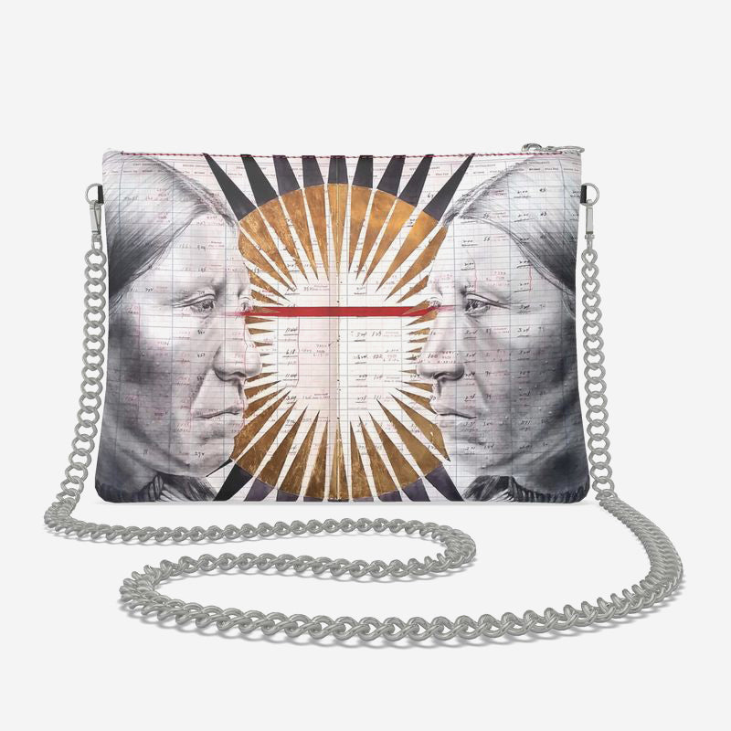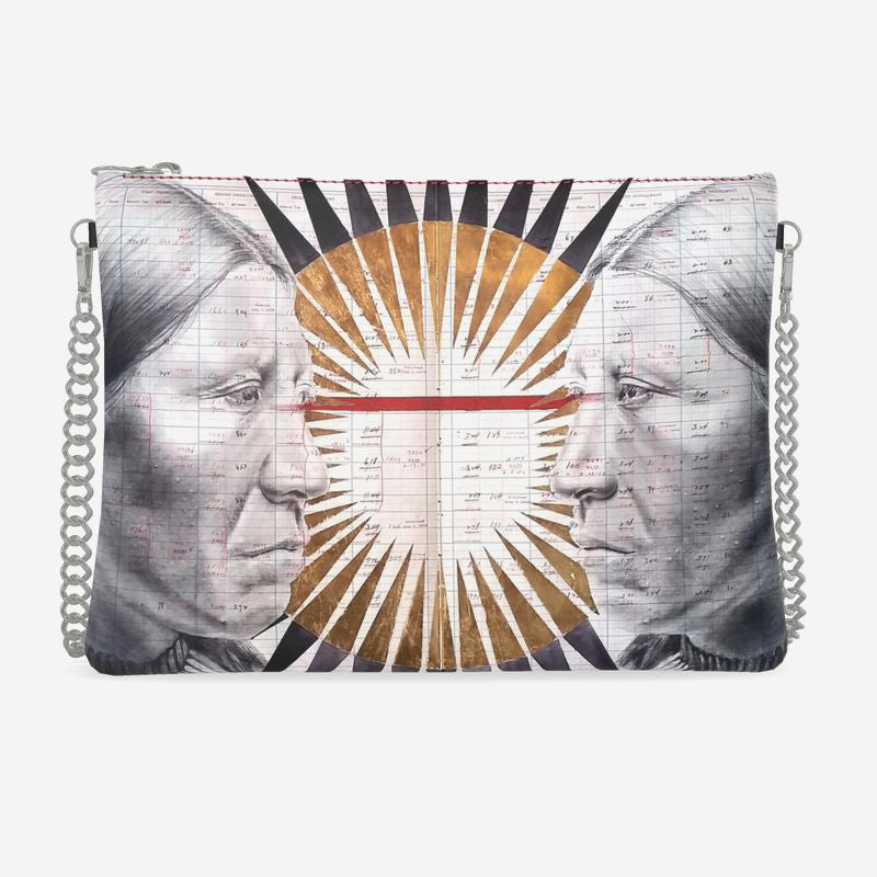This beautiful designer crossbody bag is imprinted with Chris Pappan's Welcoming.