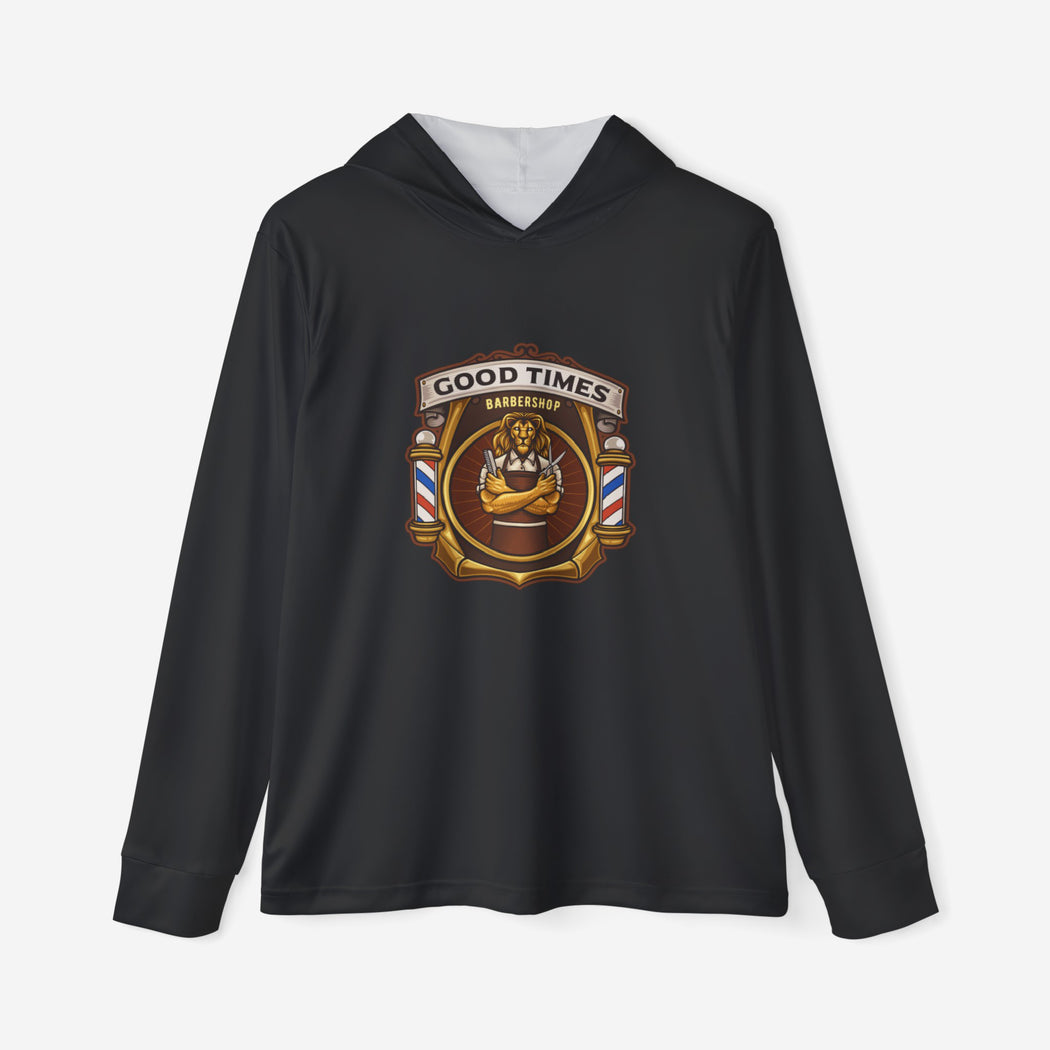 Whether it's hiking, working out, cycling, running, or simply lounging on a casual day, these hoodies remain breathable, stylish, and totally comfy. Printed with imagery by Good Times Barbershop.