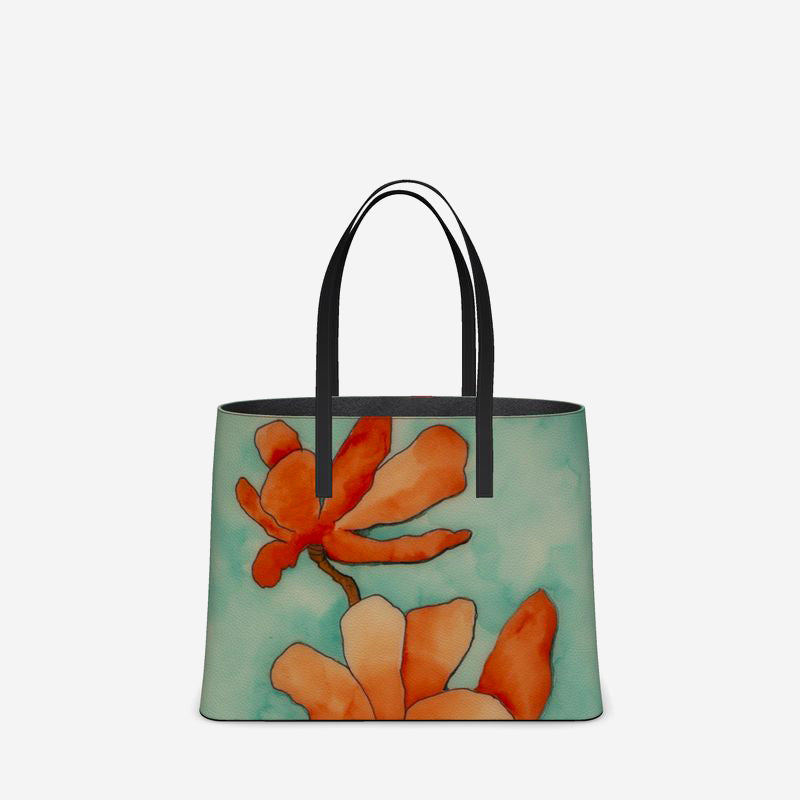 This stunning, custom leather tote is imprinted with Helen K. Tindel's Baraka Blooms.