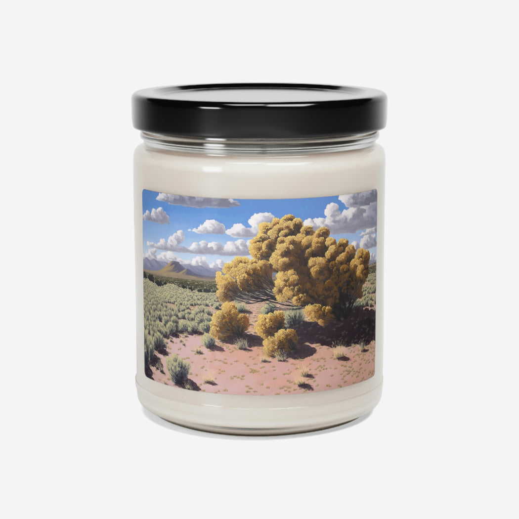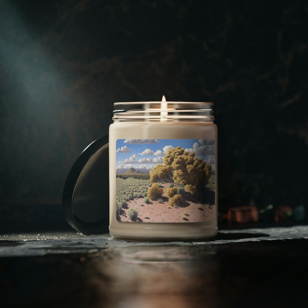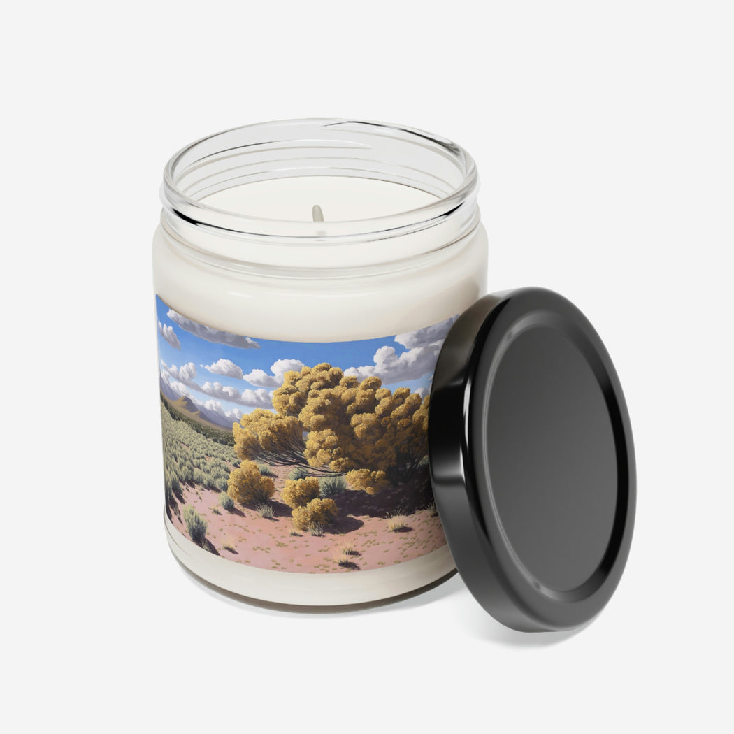 Packed with immersive aromas, these scented candles are made with 100% natural soy wax blend.  Printed with Doug West's Chamisa Temple.
