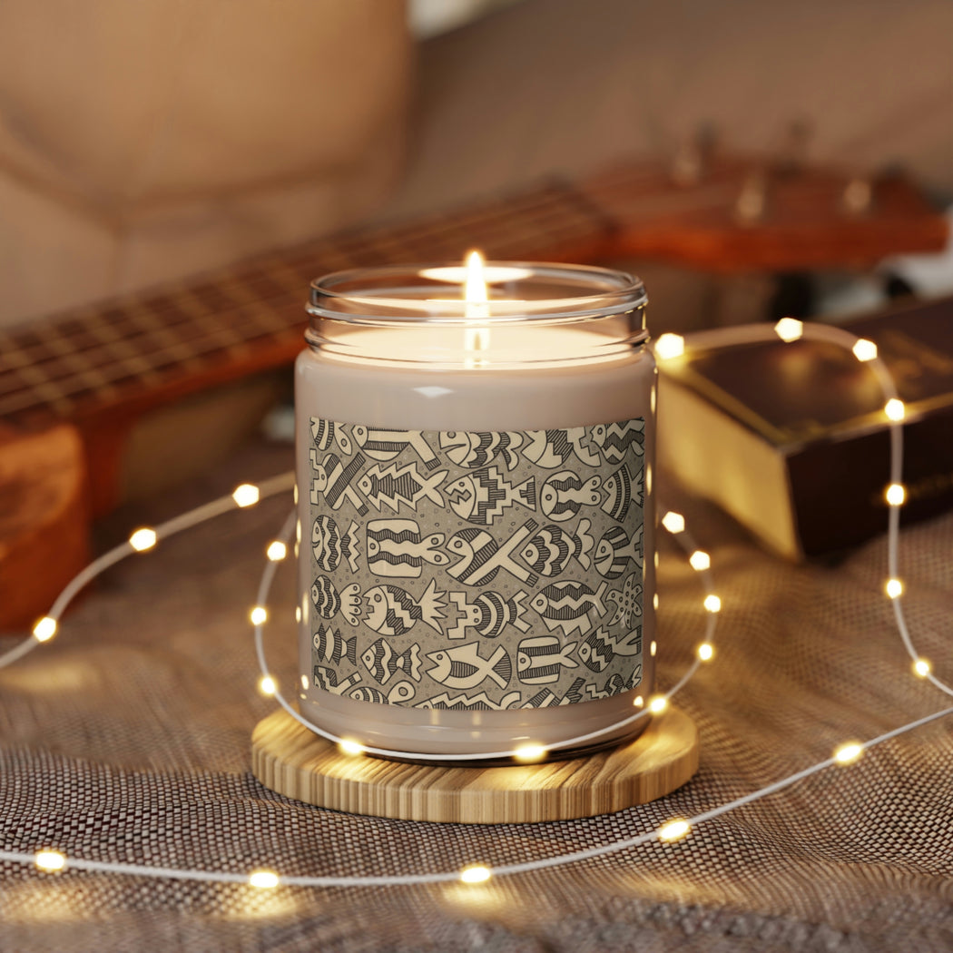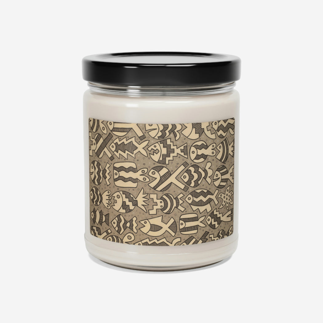 Packed with immersive aromas, these scented candles are made with 100% natural soy wax blend. Printed with Jody Naranjo's Monochromatic Fish.