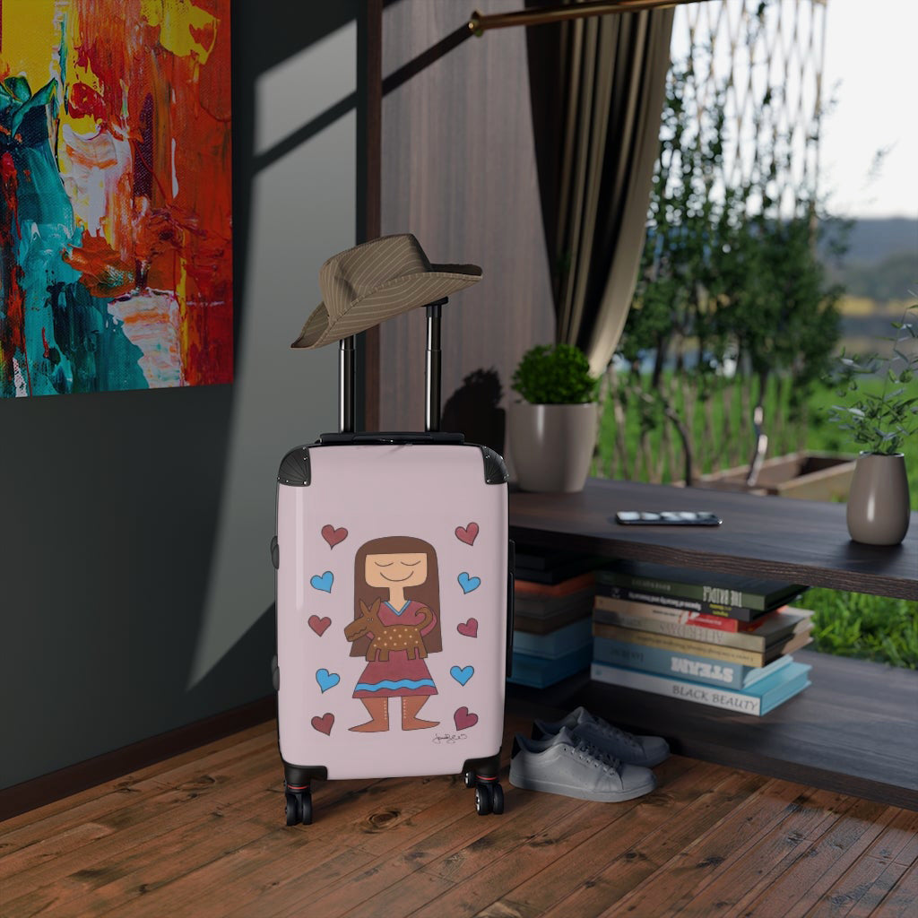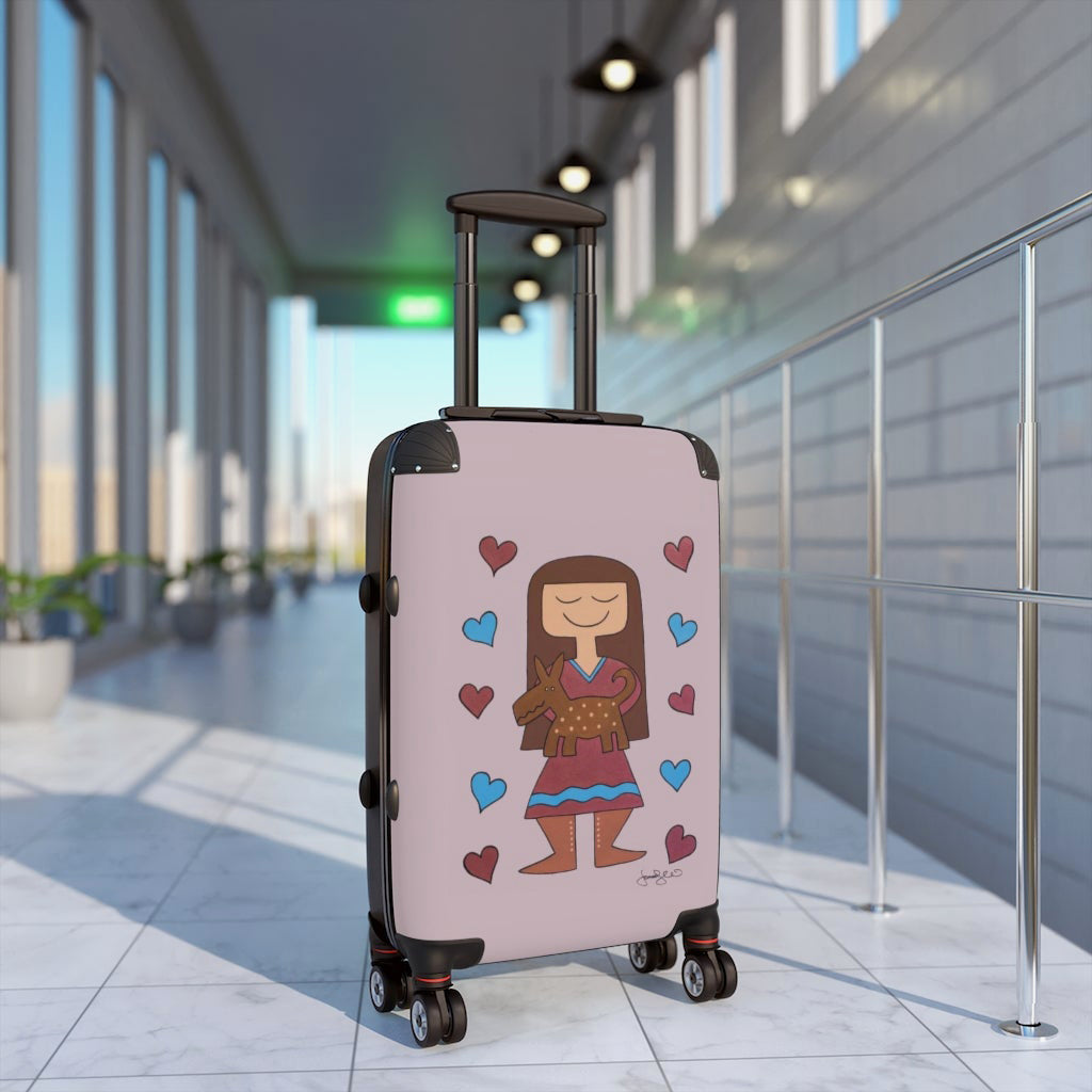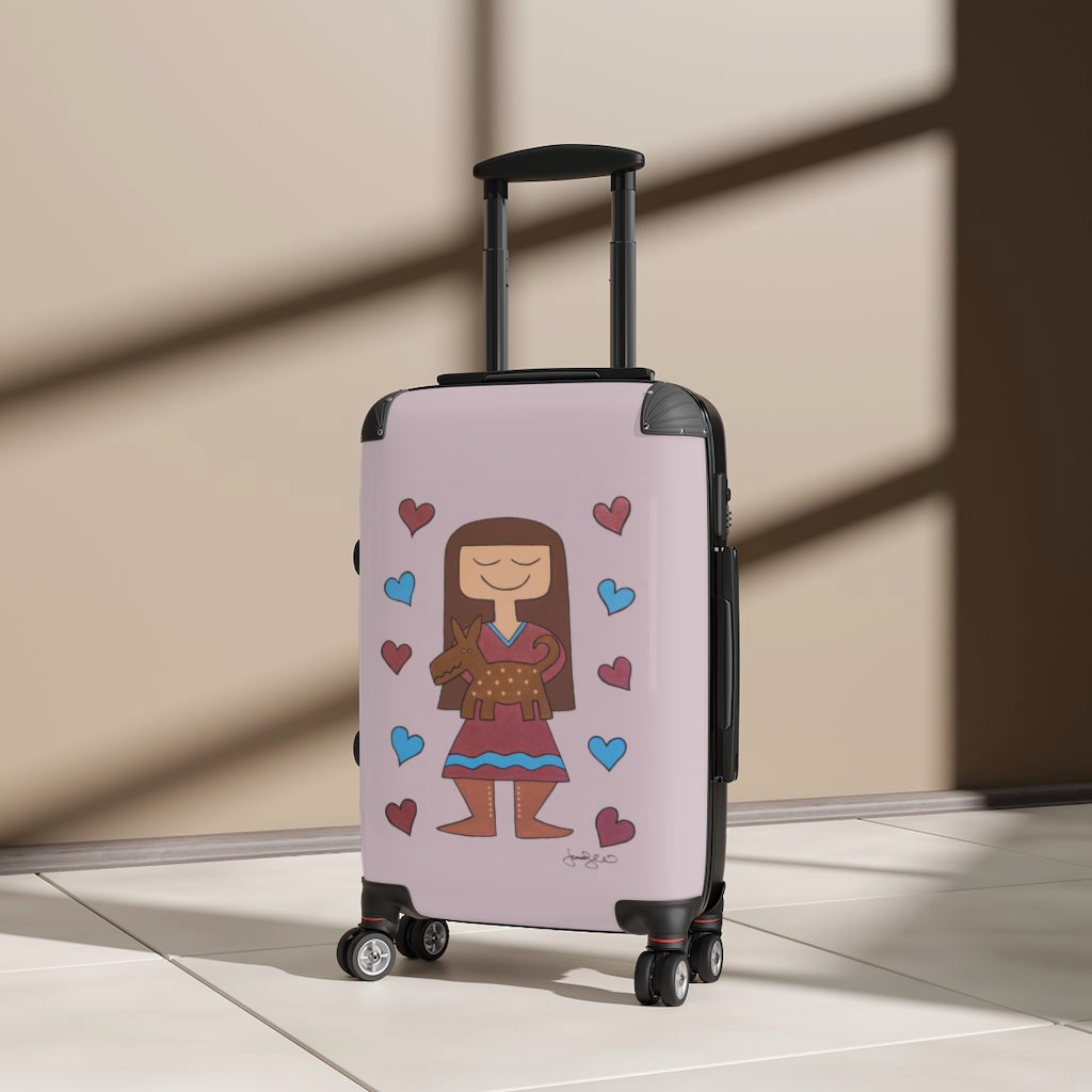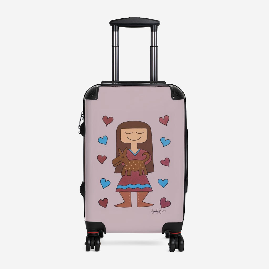 Make a bold statement with this wheeled carry on imprinted with Jody Naranjo’s Just Me and My Dog.