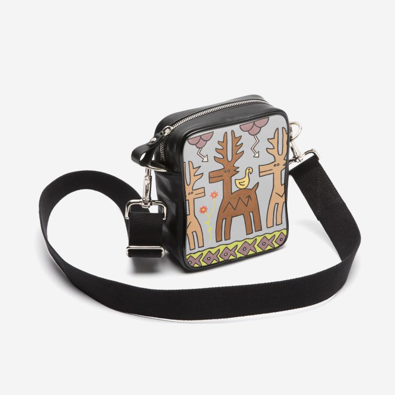 Classic leather messenger bags are imprinted with Jody Naranjo’s Oh, My Deer!
