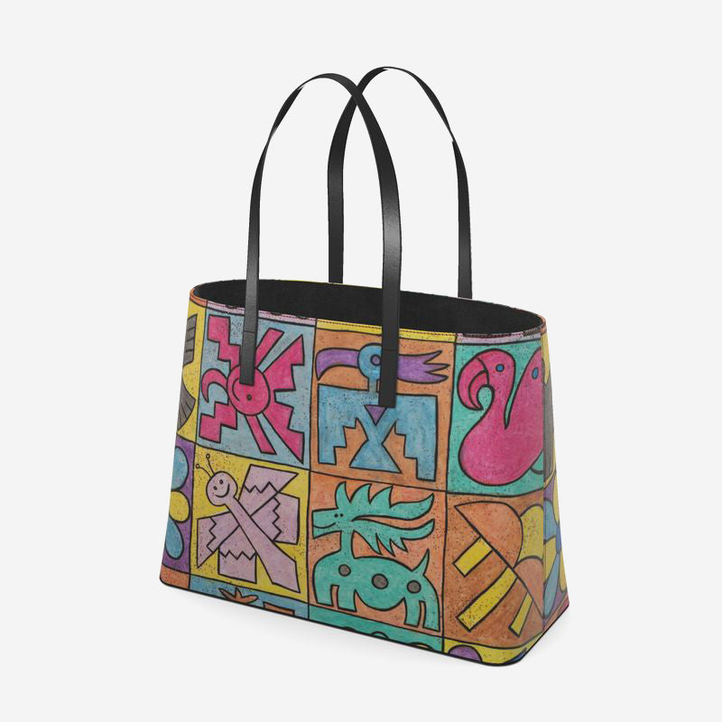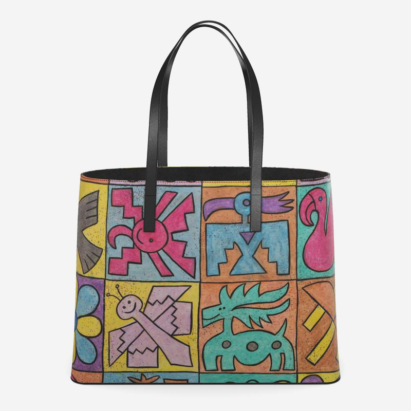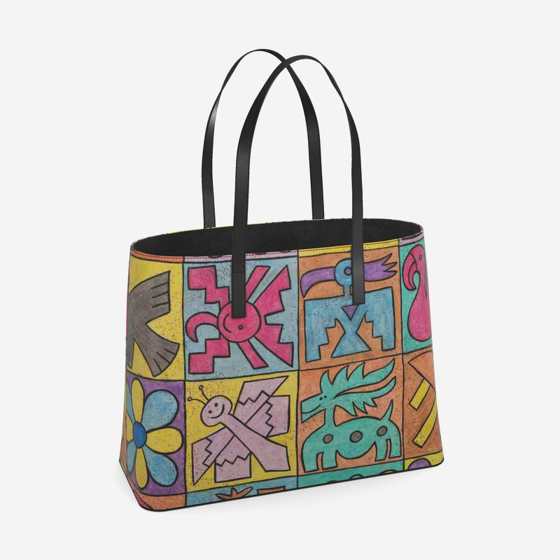 This stunning, custom leather tote is imprinted with Jody Naranjo’s Play Time.