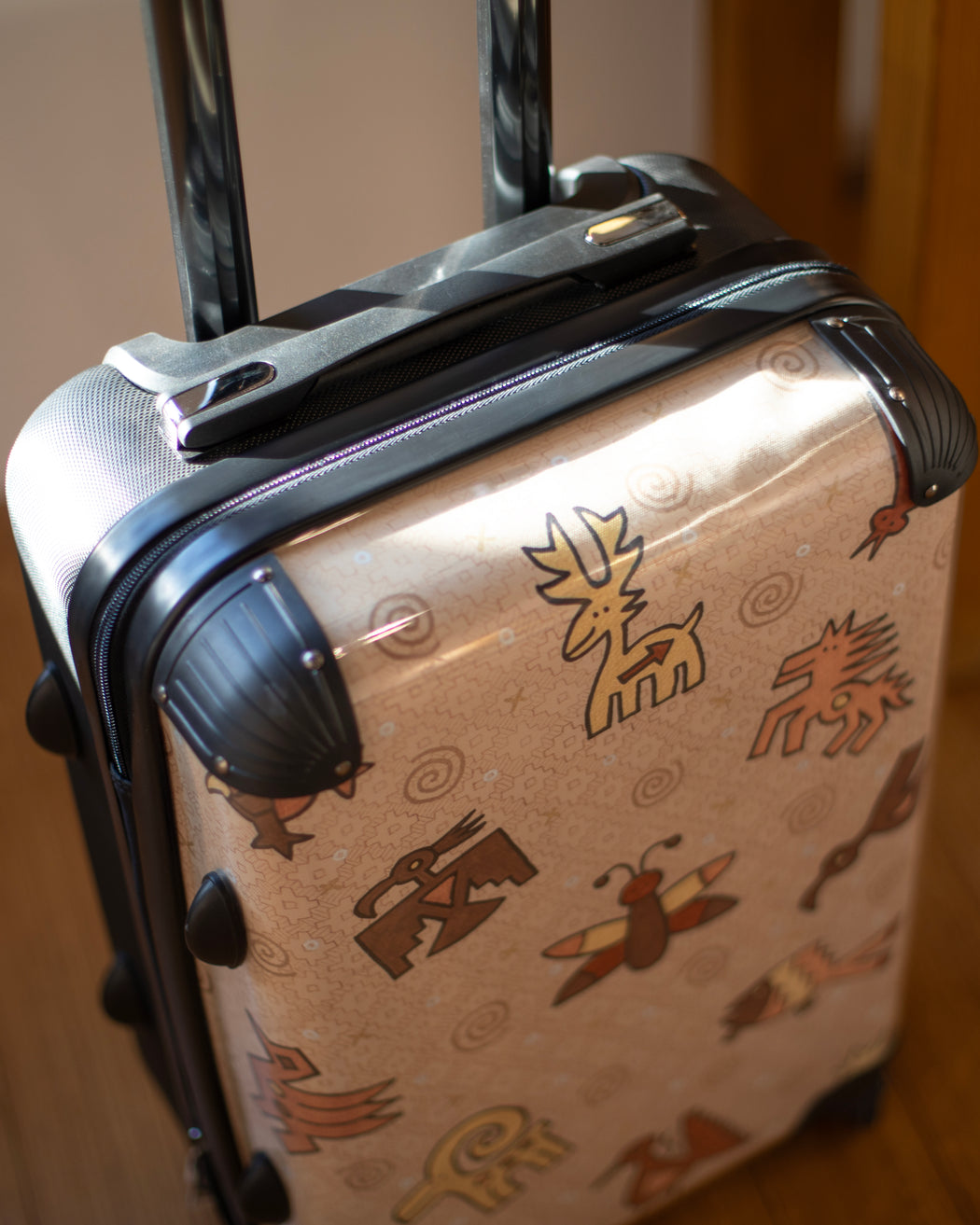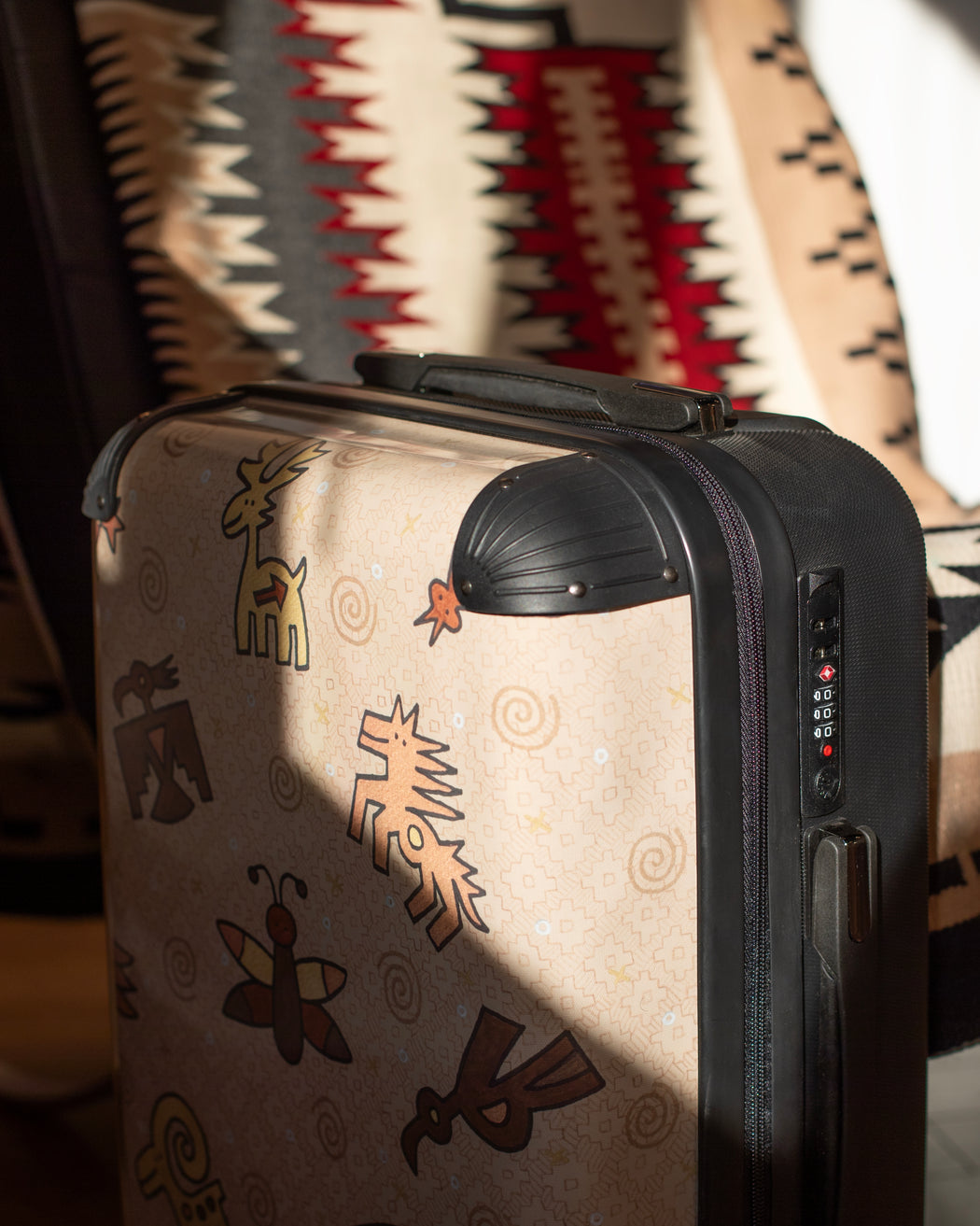 Make a bold statement with this wheeled carry on imprinted with Jody Naranjo’s Pueblo Constellations.