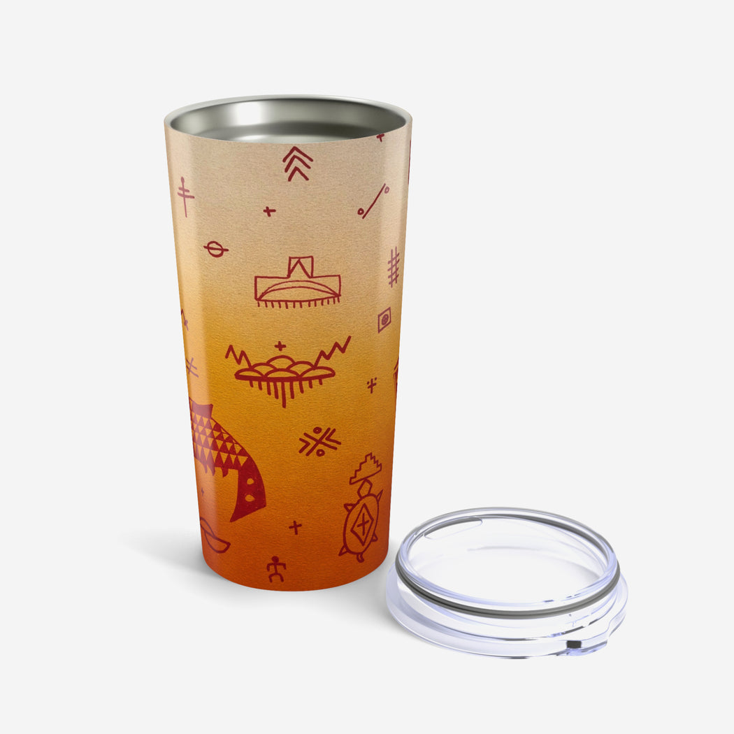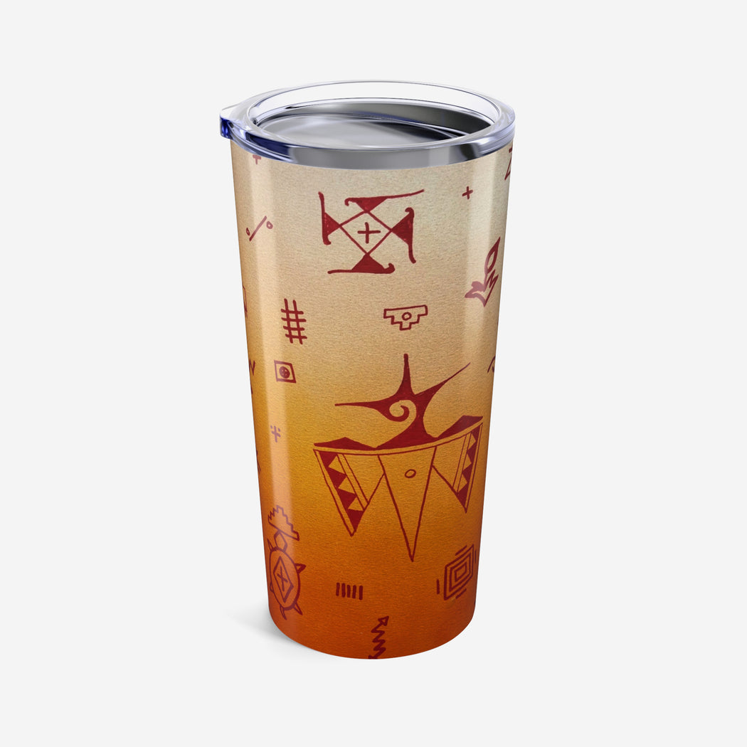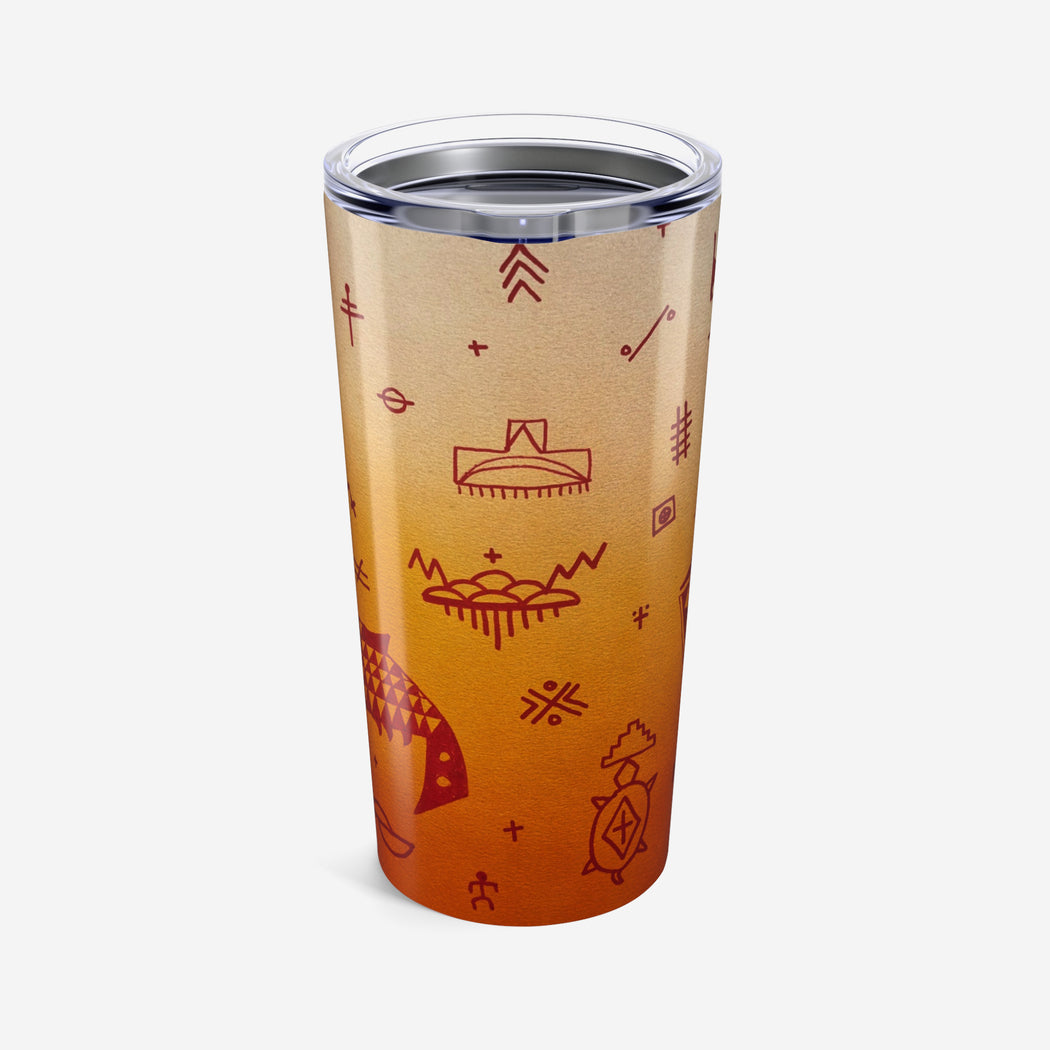 This 20oz tumbler is imprinted with Jesse Littlebird's Glyph Flash Sheet no. 3. A stainless travel-size tumbler, it's vacuum-insulated and built to last. It's perfect to express your style.