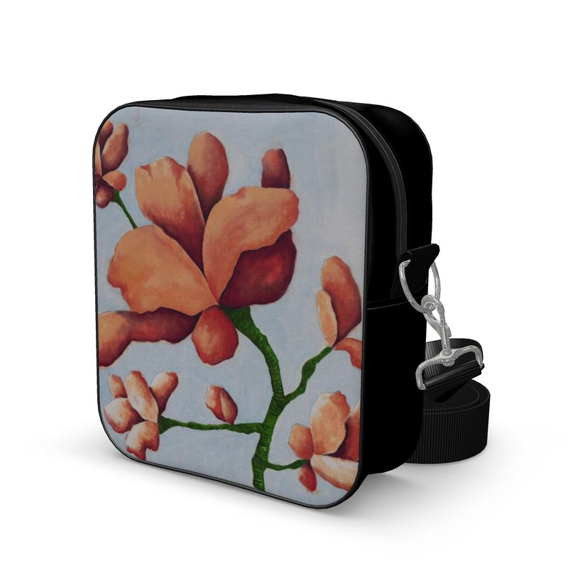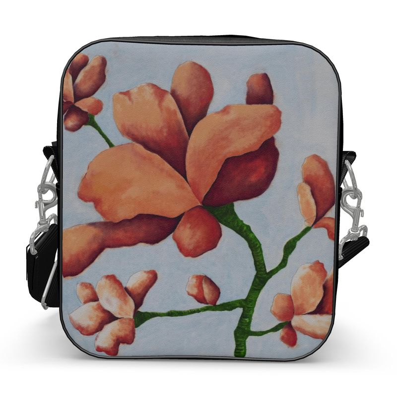 Classic leather messenger bag imprinted with Helen K. Tindel’s Como la Flor.