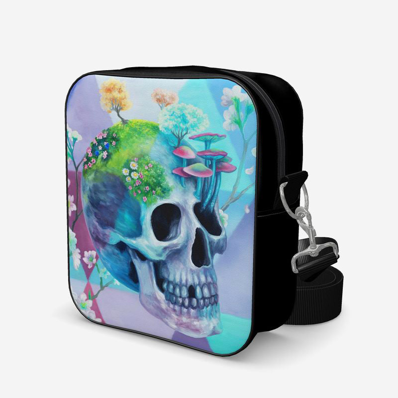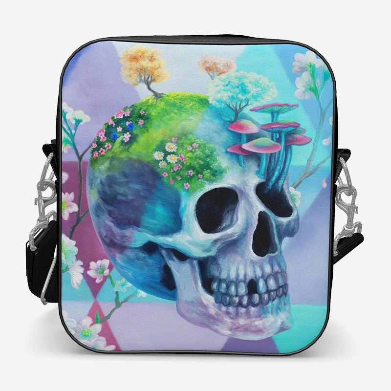 Classic leather messenger bag imprinted with Andrea Peterson’s Eternal Bloom.