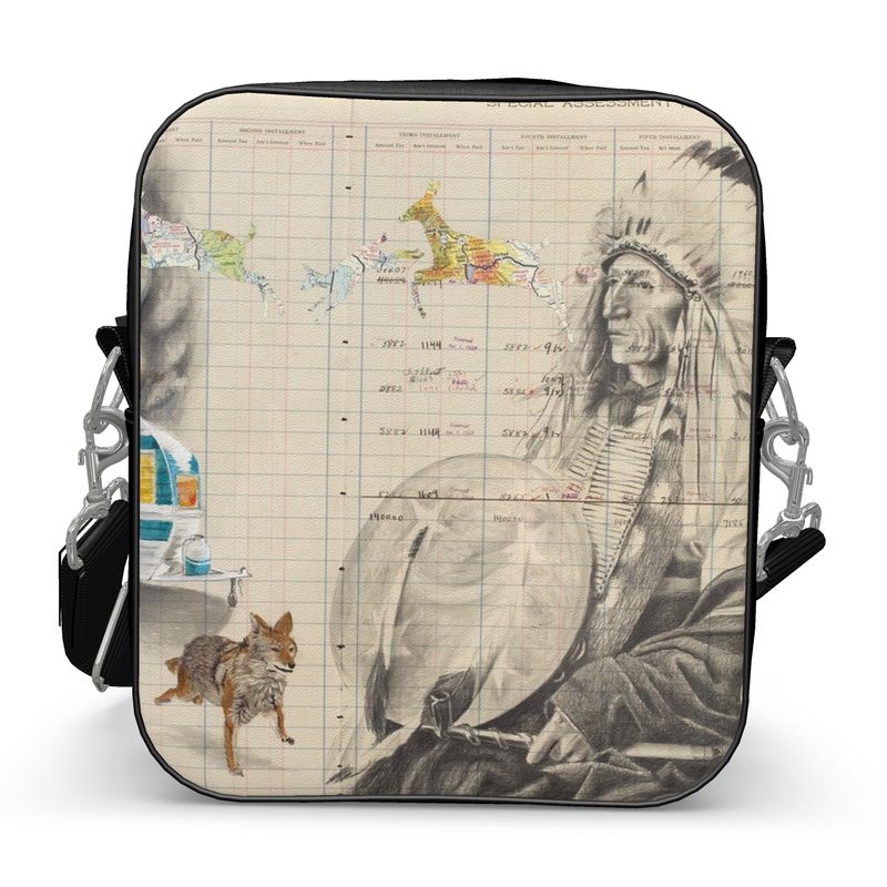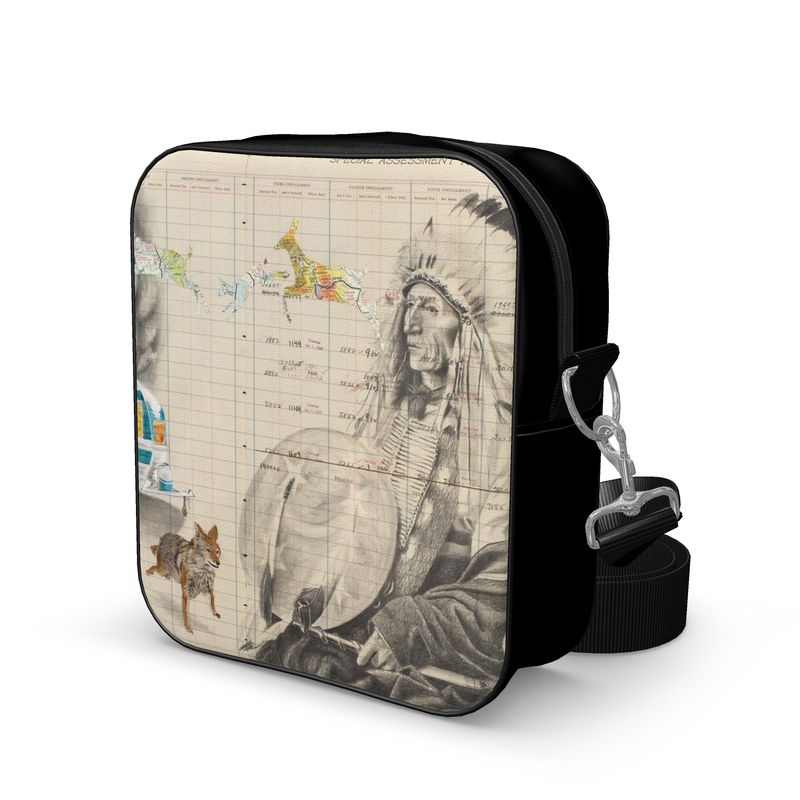 Classic leather messenger bag imprinted with Chris Pappan’s The Fire Within