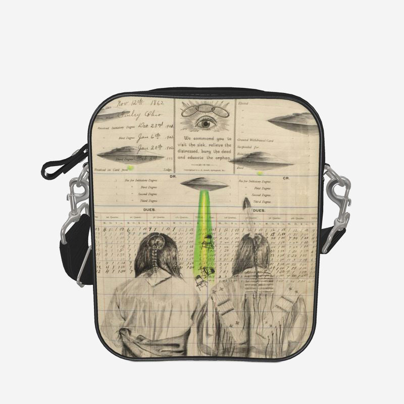 Classic leather messenger bag imprinted with Chris Pappan's In Search Of...(Round Dance)