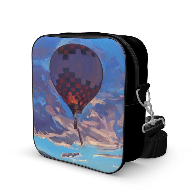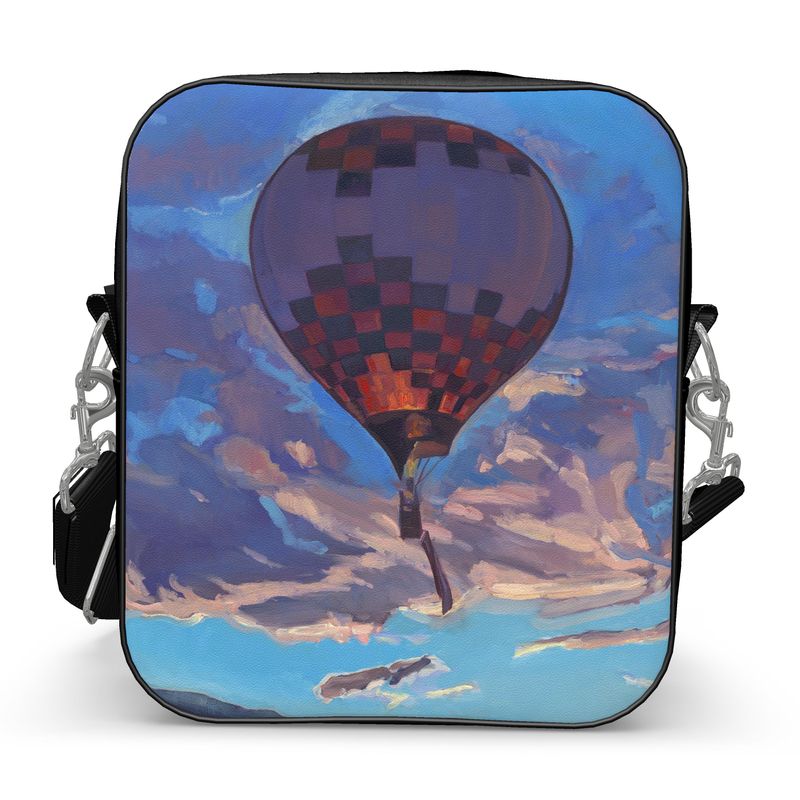 Classic leather messenger bag imprinted with Kathryn Stedham's Up and Away, Sandia Sky.