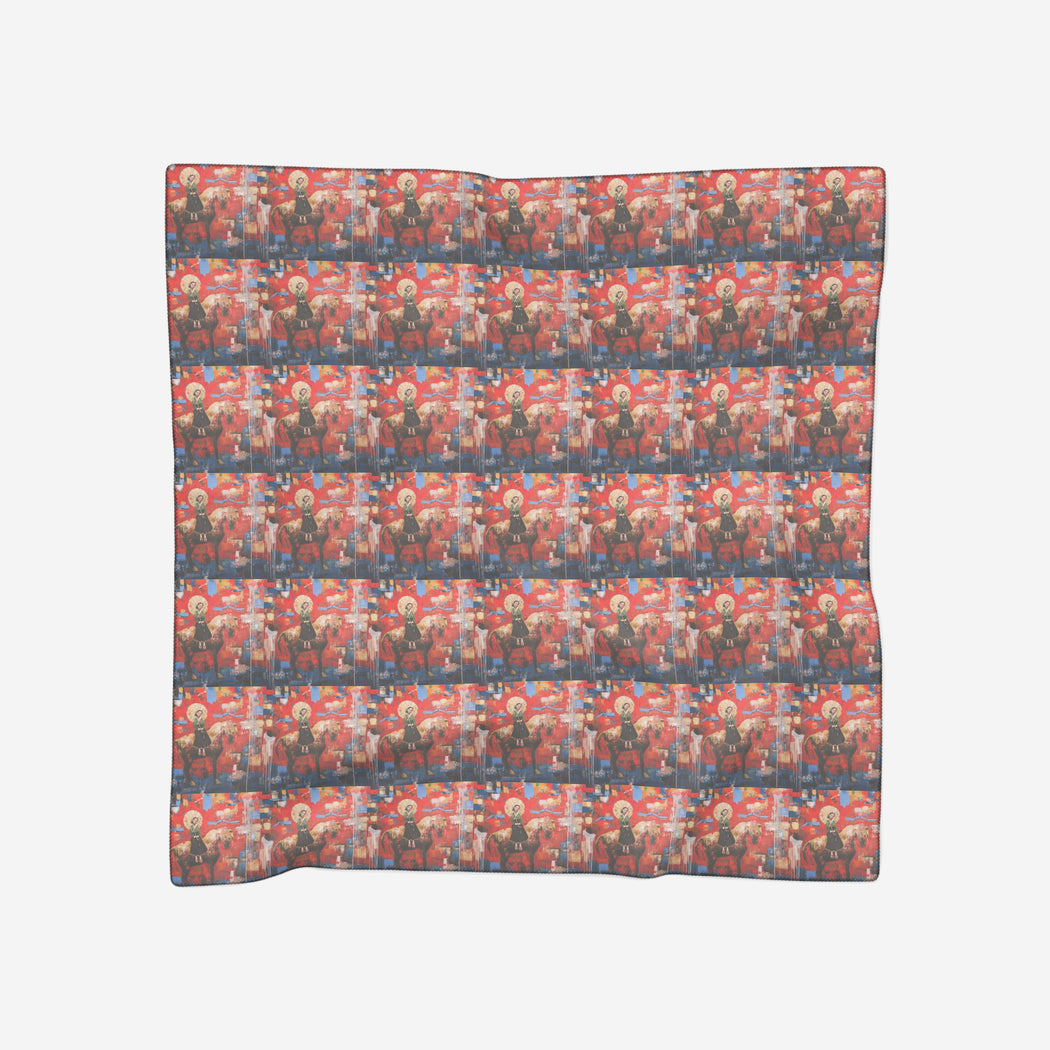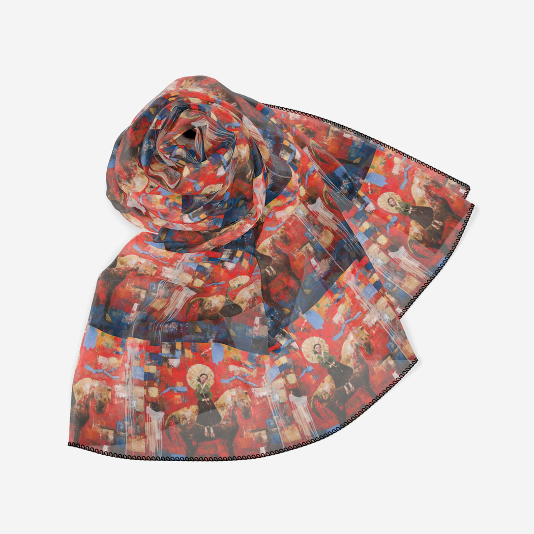 Create the perfect accessory that ties together any outfit with these sheer, extremely light and airy scarves. Printed with Rimi Yang's Ride in Sunset.